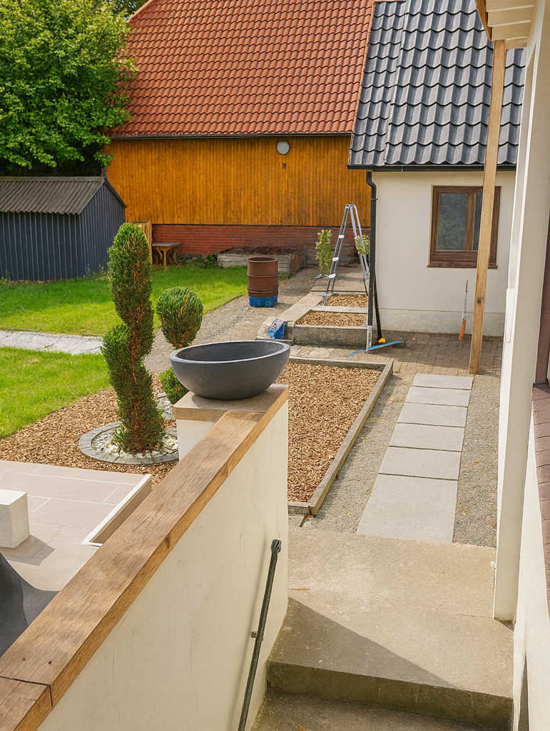 Garten: pflegeleicht, mit Sonnenterrasse, Geräteschuppen und zusätzlichem Nebengebäude