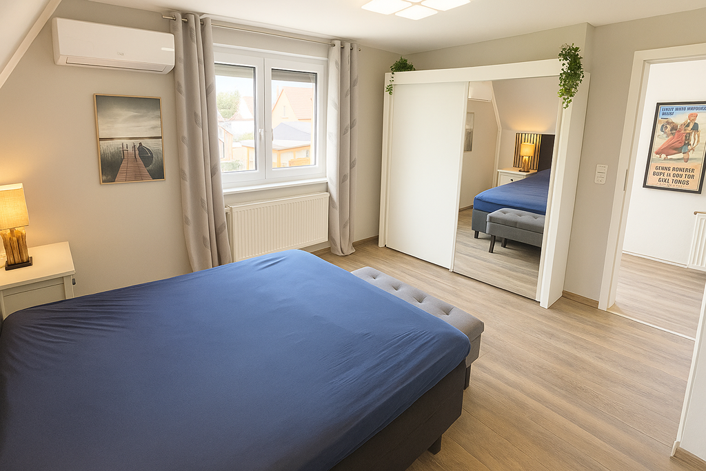 Obergeschoss: Schlafzimmer mit Split-Klimaanlage (Heizen & Kühlen), weiteres Zimmer (Kinder-/Arbeitszimmer), beide mit Außenrollläden