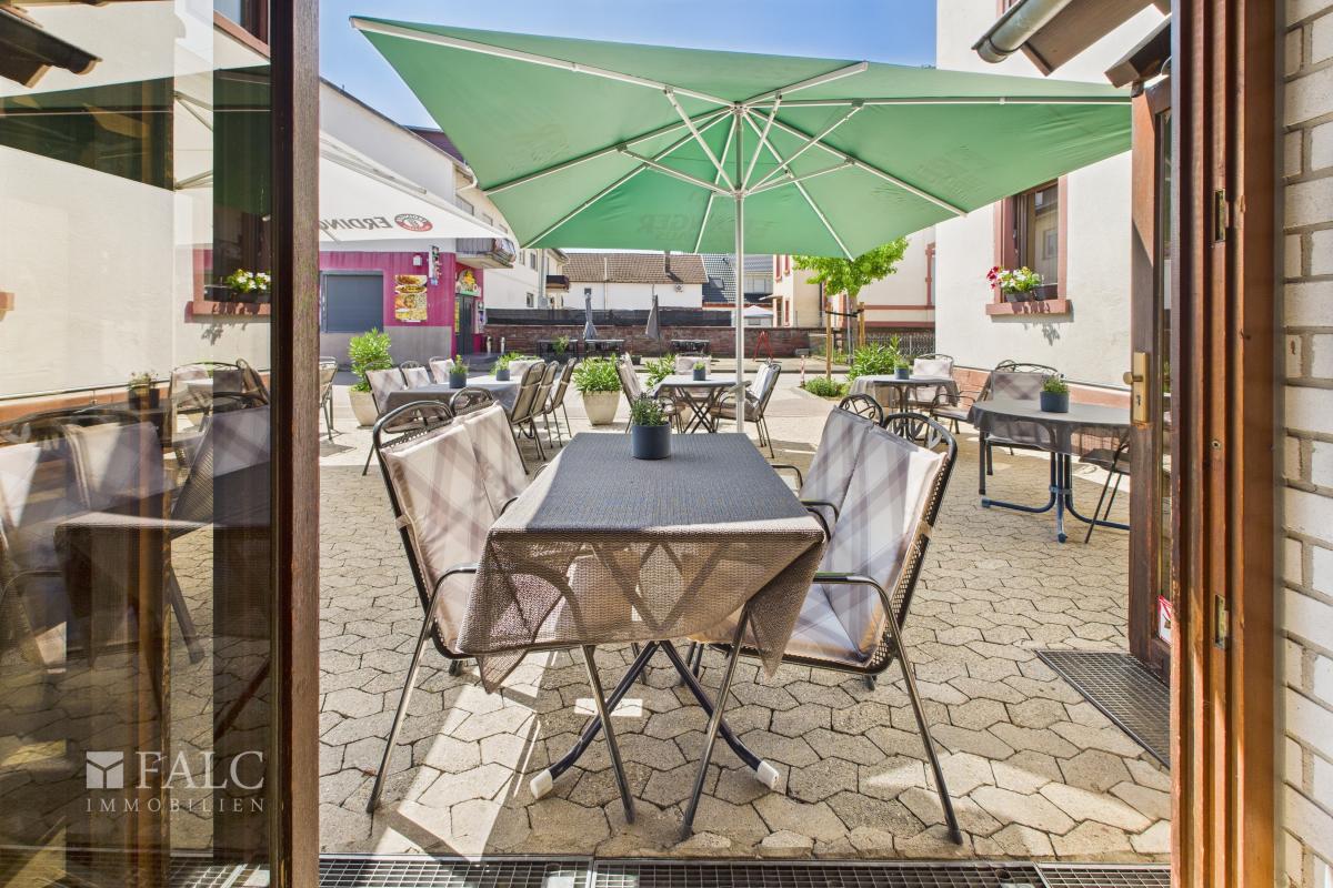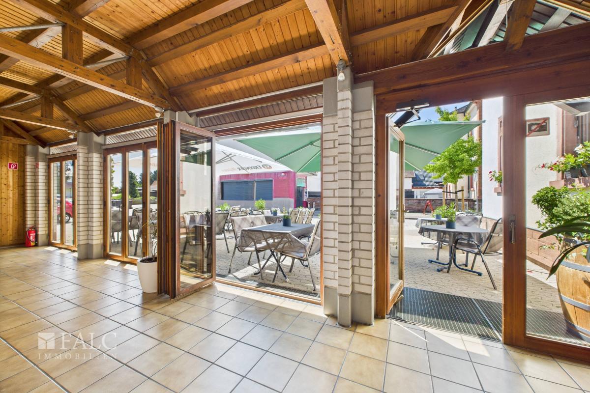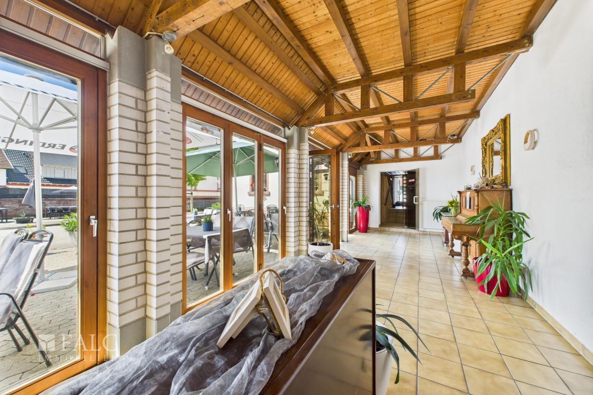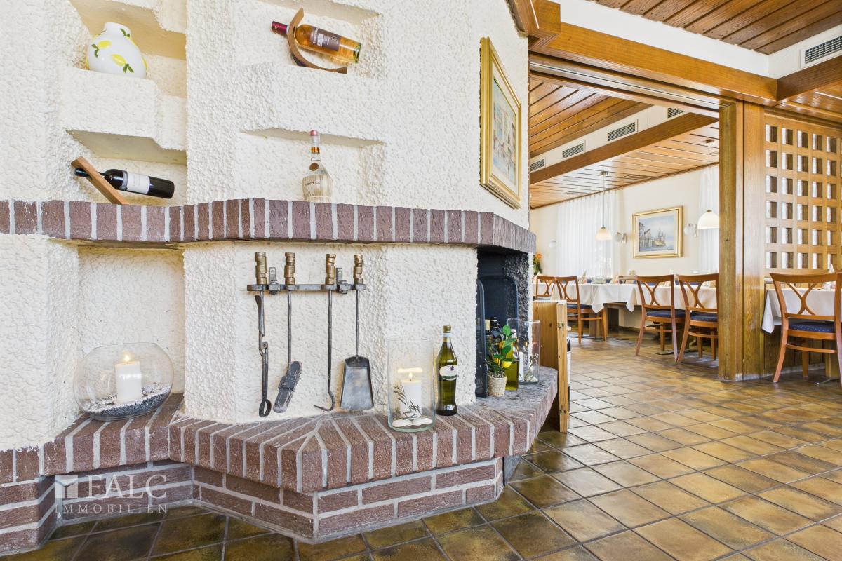 Ein besonderes Highlight ist der lichtdurchflutete Wintergarten, der mit dem angrenzenden Außenbereich hinter dem Haus verbunden ist. Diese Erweiterung des Gastronomiebereichs schafft Raum für zahlreiche Gäste und bietet die ideale Kulisse für sommerliche Abende, gesellige Feiern oder stilvolle Veranstaltungen unter freiem Himmel. Für zusätzlichen Komfort sorgen die modernen Gäste-WCs im Restaurantbereich.