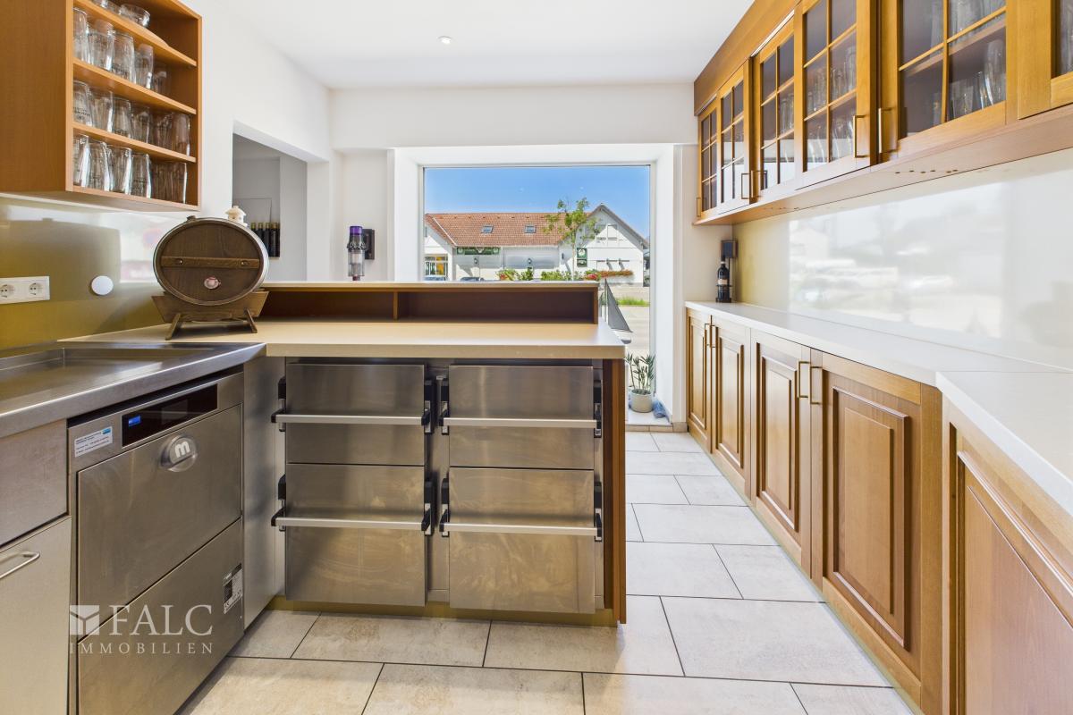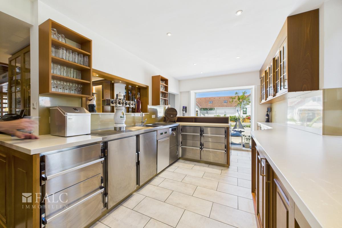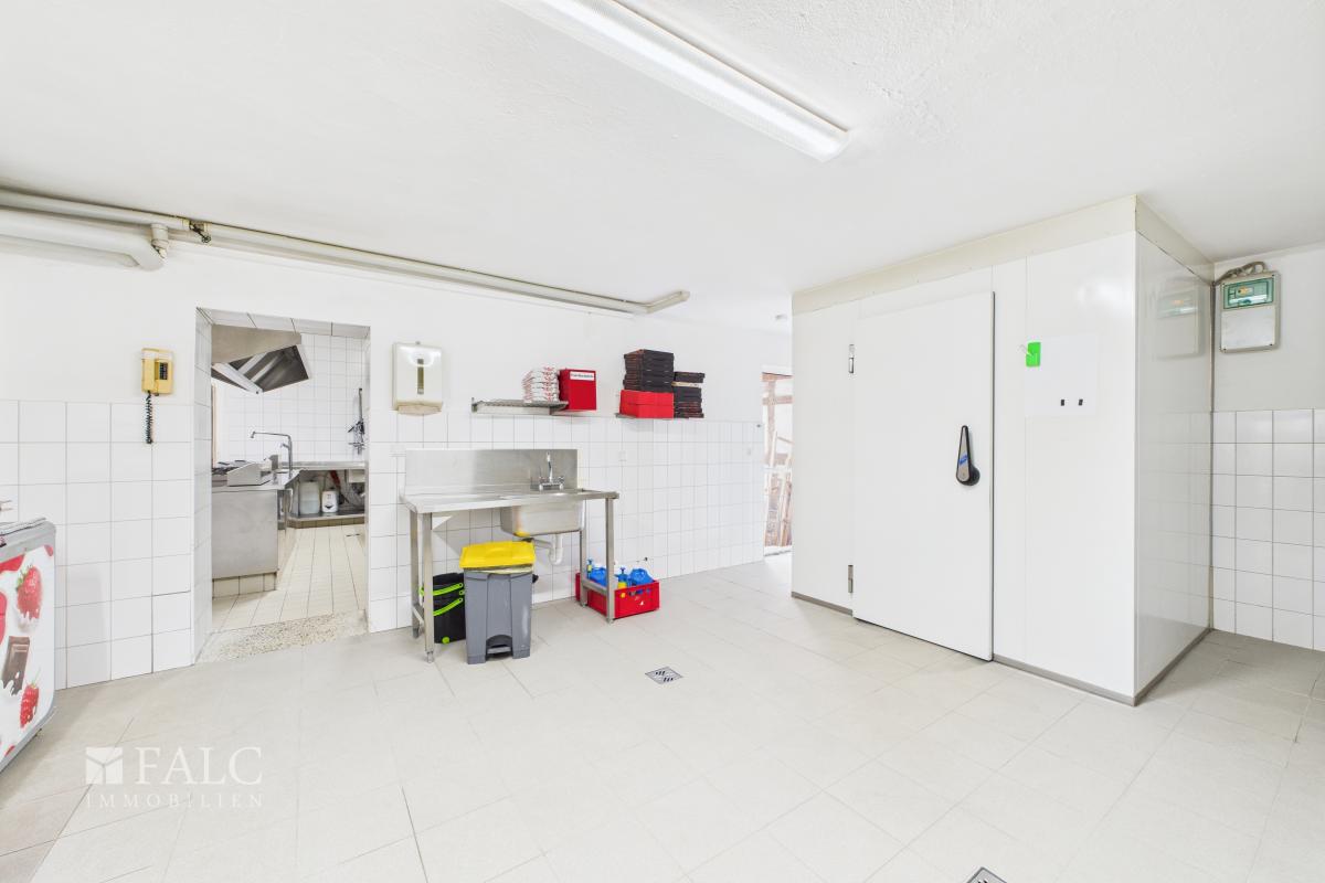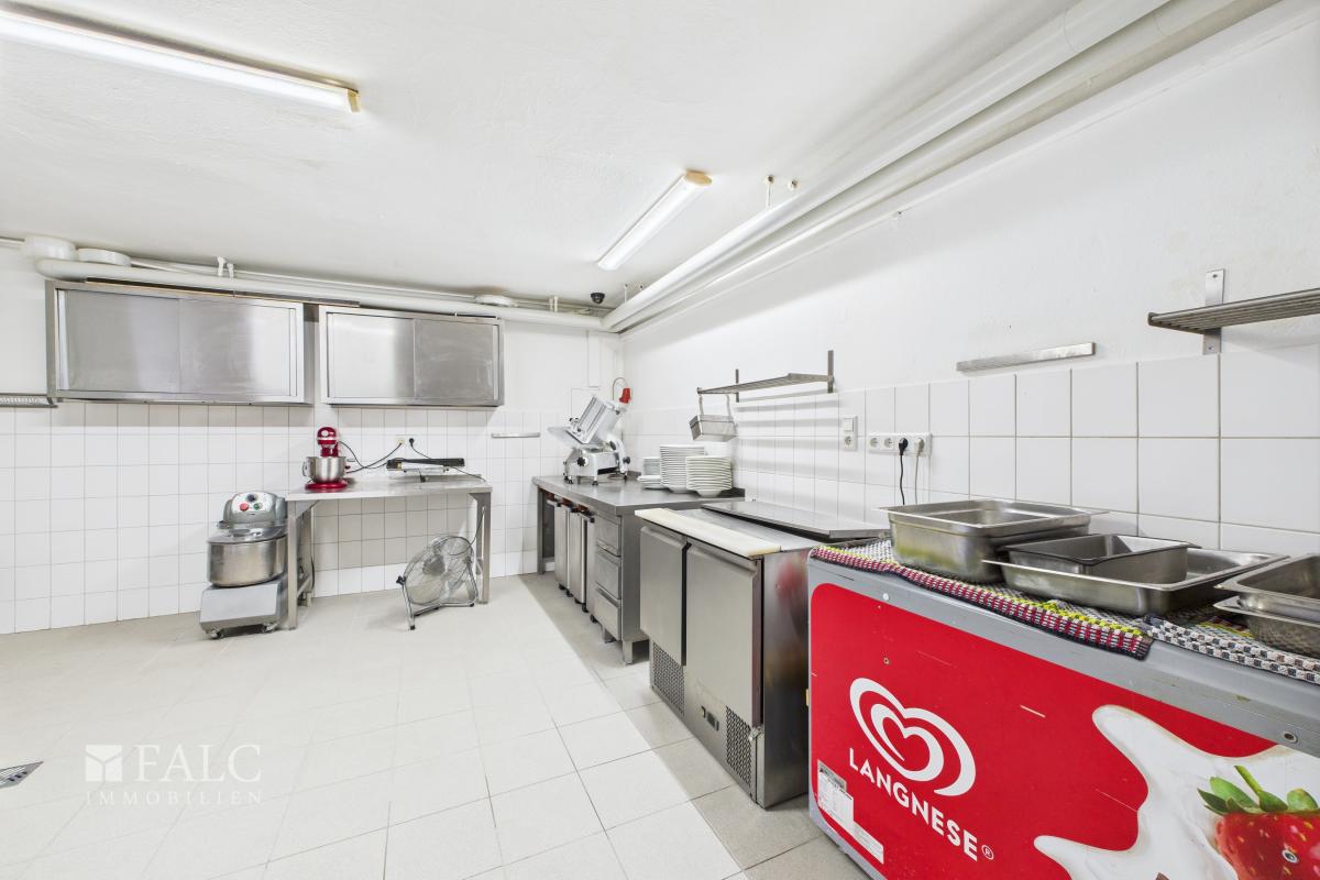 Die Küche ist professionell ausgestattet und auf einen vollwertigen Gastronomiebetrieb ausgelegt. Mit Kochbereich, separatem Vorbereitungsraum sowie einem Kühlraum bietet sie optimale Bedingungen, um kulinarische Köstlichkeiten auf höchstem Niveau zuzubereiten.
