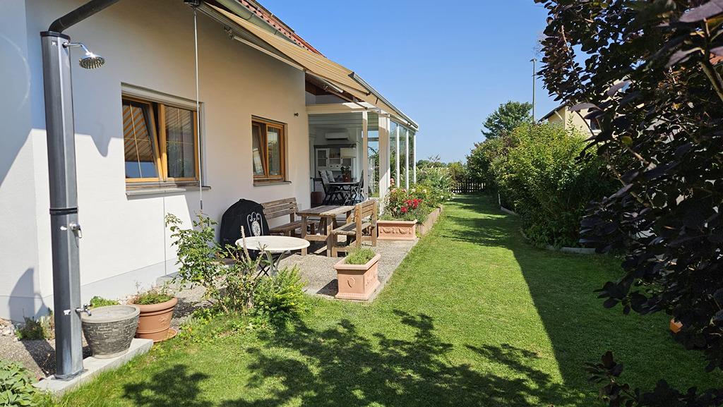 Ein liebevoll angelegter Garten mit automatischer Pflege durch einen Mähroboter lädt zum Verweilen ein. Zwei sonnige Terrassen und eine erfrischende Sommerdusche machen den Außenbereich zur privaten Wohlfühloase.