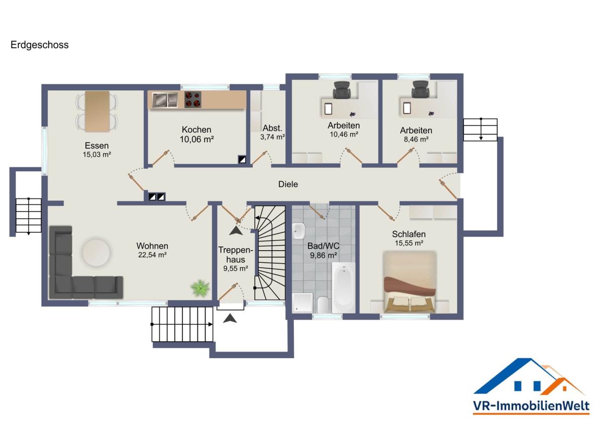 Im Erdgeschoss erwarten Sie ein Wohn-/Essbereich, eine Küche, ein Abstellraum, ein Büro, ein Schlafzimmer, ein Badezimmer, ein weiteres Zimmer sowie ein Balkon mit Zugang zum Garten.