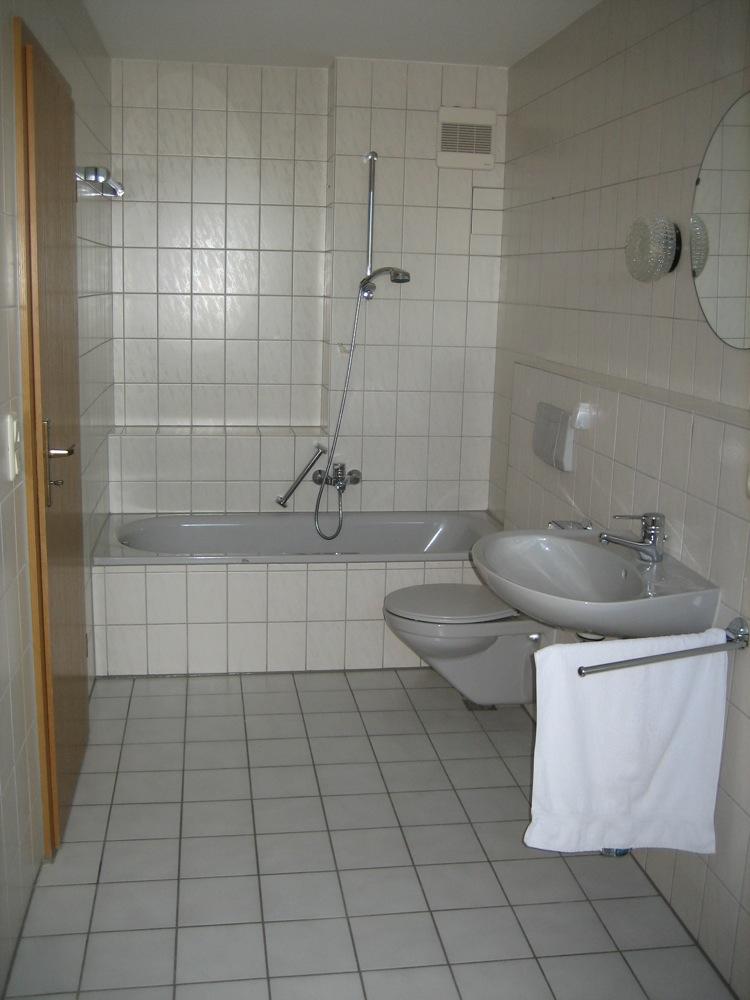 Das Wannenbad mit Fenster verfügt über einen Waschmaschinenanschluss und ein zusätzliches WC.