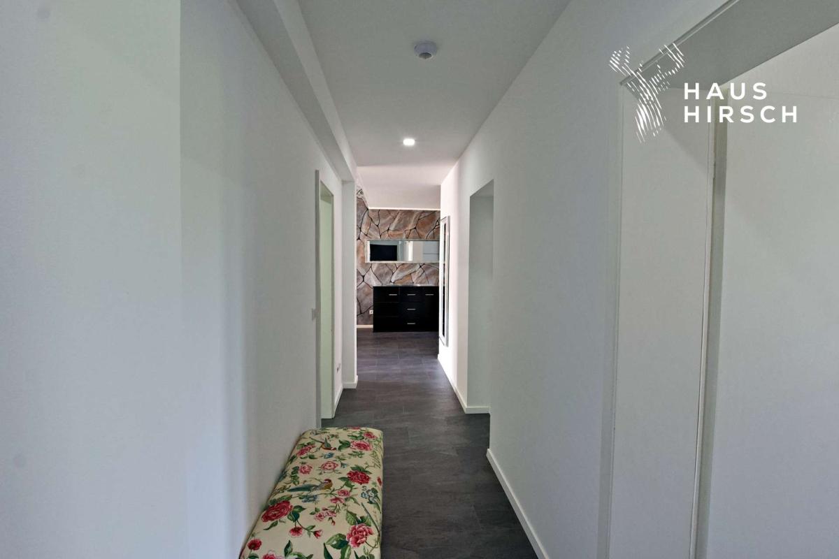 Ein offener Flur empfängt Sie beim Betreten der Wohnung. Auf der rechten Seite befindet sich das erste Schlafzimmer – ideal als Gästezimmer oder fürs Homeoffice. Auf der linken Seite liegt ein modernes Badezimmer mit Dusche sowie einem praktischen Stellplatz für eine Waschmaschine.