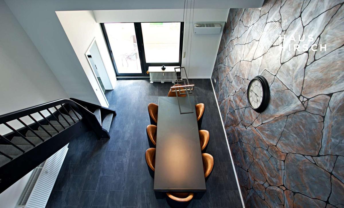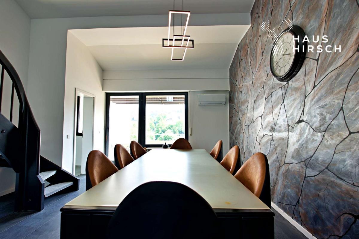 Weiter führt Sie der Weg in den großzügig gestalteten Wohn-Essbereich. Der offene Blick zur Galerie-Etage unterstreicht das luftige Raumgefühl. Auf der rechten Seite erwartet Sie ein weitläufiges Wohnzimmer mit großen Fensterflächen, die für eine angenehme, lichtdurchflutete Atmosphäre sorgen. Links davon bietet der Essbereich ausreichend Platz für gesellige Familienfeste und lange Abende an einem großen Esstisch. Mit direktem Zugang zum sonnigen Balkon, der an warmen Tagen zum zweiten Wohnzimmer wird.