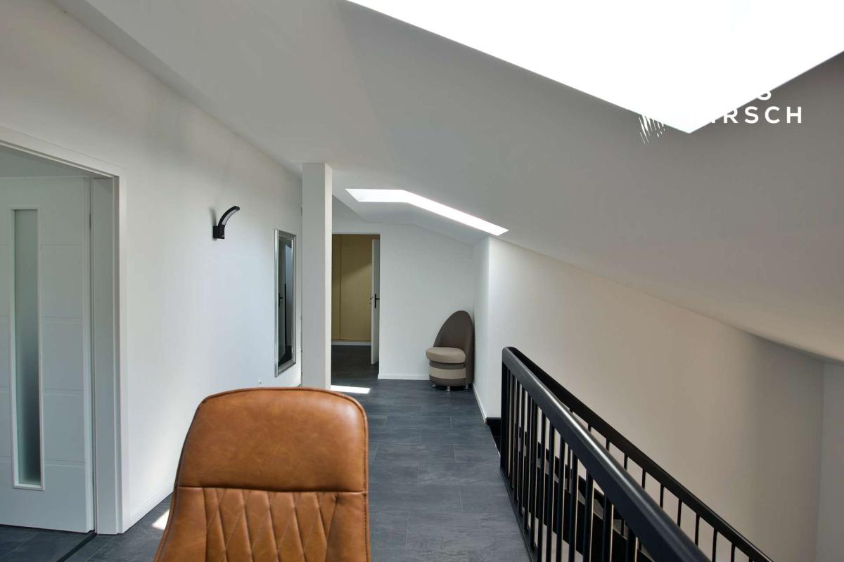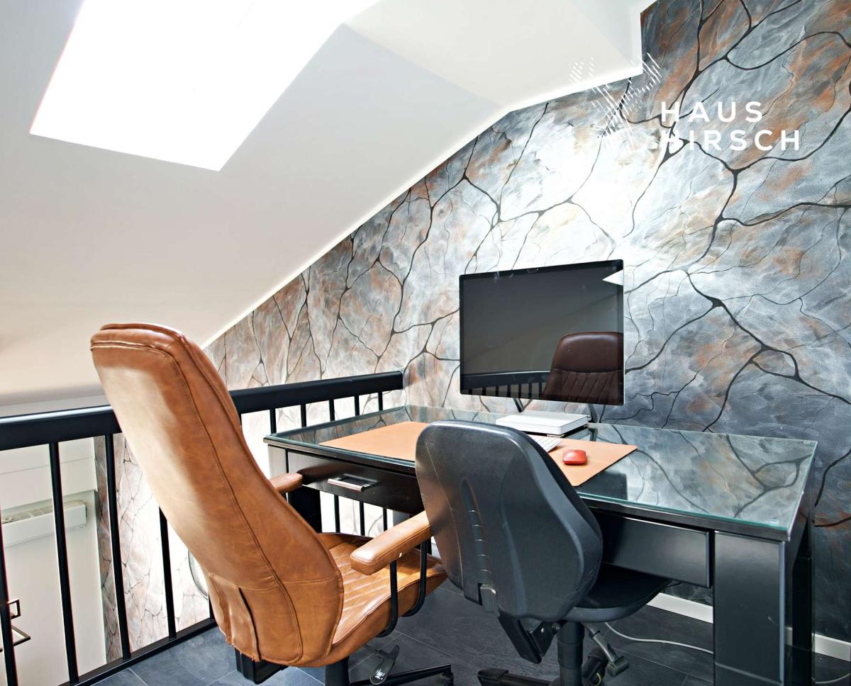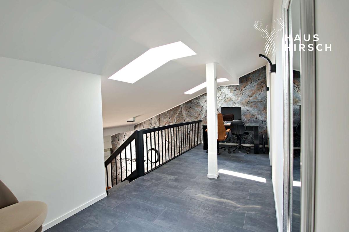 Über eine offene Treppe gelangen Sie in die zweite Etage: Im Flur oben befindet sich ein perfekt integrierter Arbeitsbereich mit Blick auf den Essbereich und den Balkon – ideal für Homeoffice oder kreative Projekte. Zudem stehen hier drei weitere Schlaf- oder Kinderzimmer zur Verfügung – perfekt für Familien mit Kindern oder Gäste. Ergänzt wird die Etage durch ein helles Badezimmer mit großem Dachfenster und moderner Regendusche.