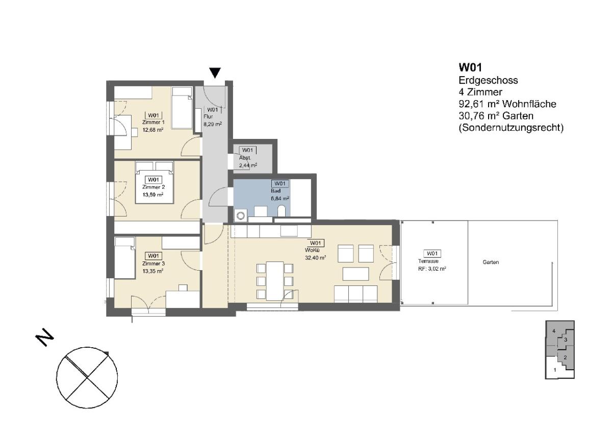 Die Zimmer sind nach Norden ausgerichtet, während die Terrasse im Erdgeschoss mit Gartenanteil nach Südwesten zeigt. So können Sie ab dem Mittag bis in die Abendstunden die Sonne genießen perfekt für entspannte Stunden im Freien, ob beim Sonnenbaden, gemütlich allein oder