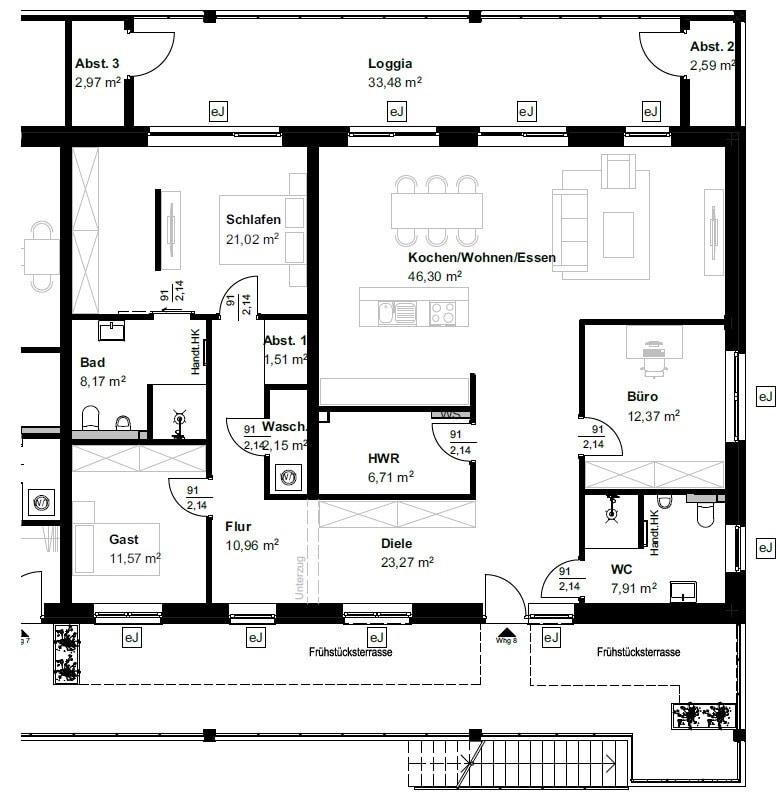 - Außenflächen: Loggia 33,47 m² & Frühstücksterrasse 19,03 m²