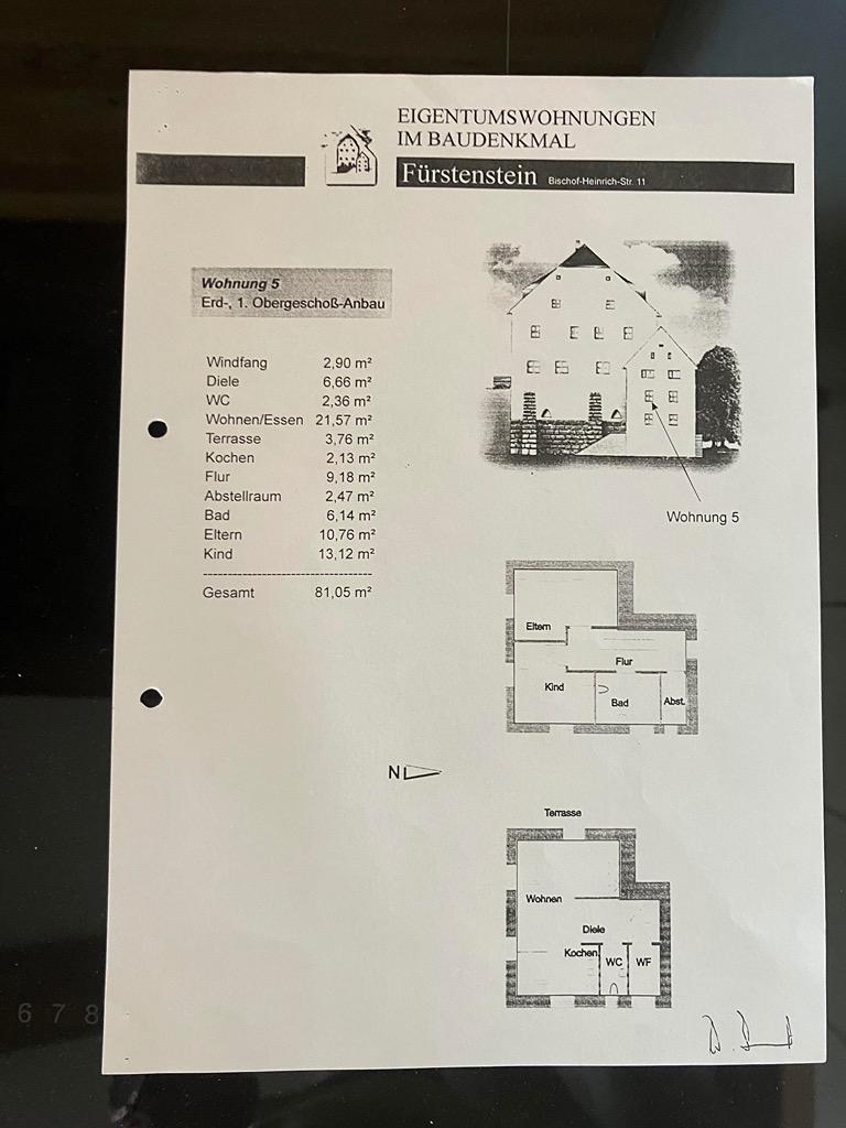 Die Wohnung erstreckt sich über das Erdgeschoss und das 1. Obergeschoss, sie besitzt zudem eine 15 m2 große, innerhalb historischer Mauern geschützt liegende Terrasse mit einem unverbaubarem Ausblick in den Bayerischen Wald.