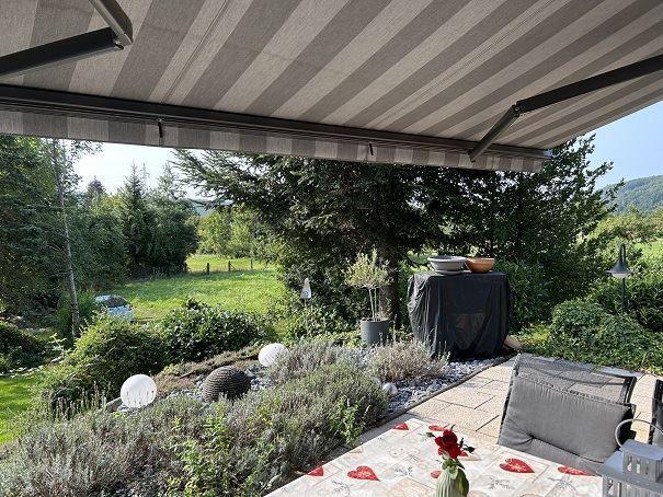 Freisitz mit Waschbetonplatten und Markise, teilüberdacht;
