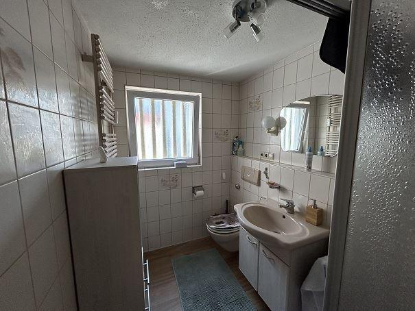 Duschbad mit Fenster, Laminatboden und Wandfliesen, ausgestattet mit Dusche, WC und Waschbecken;