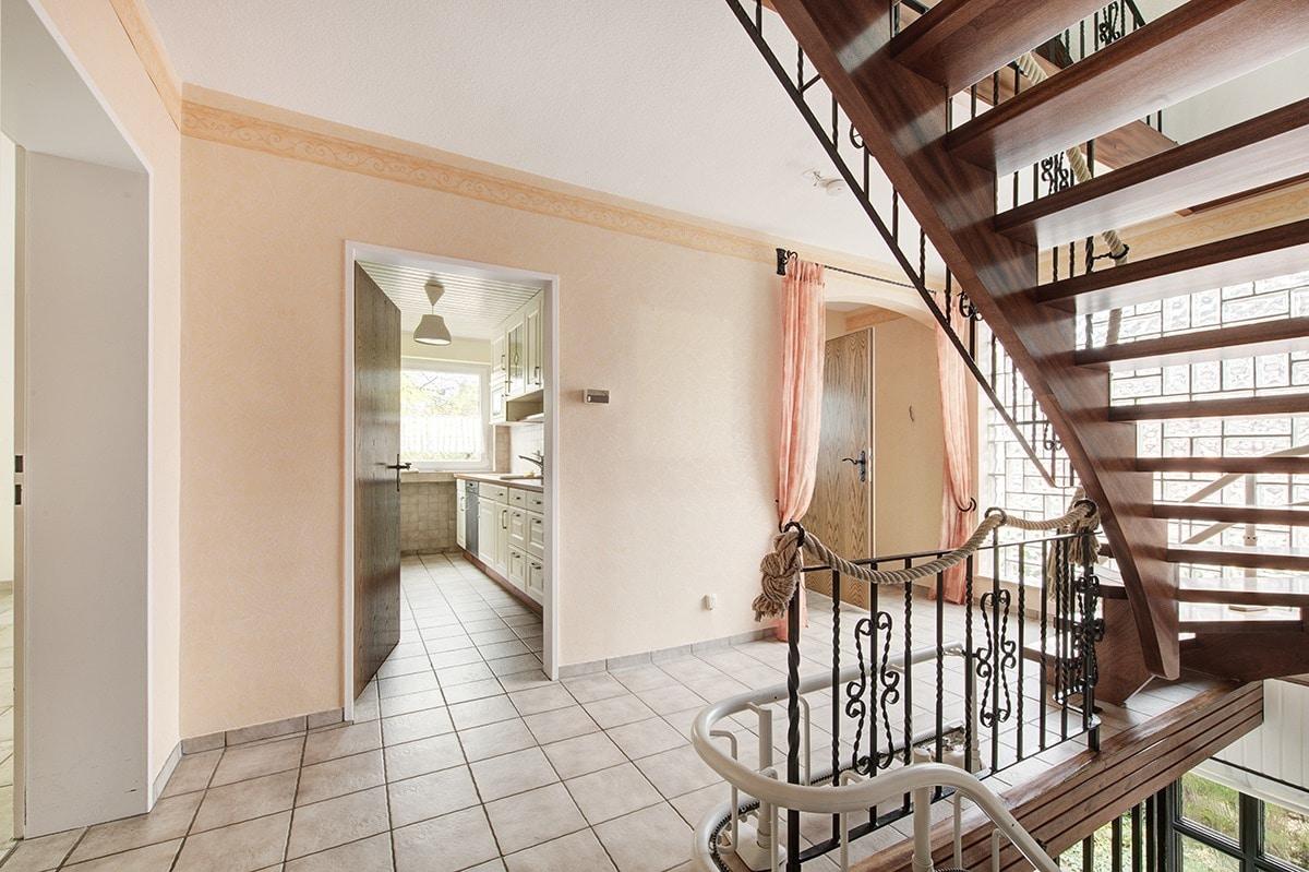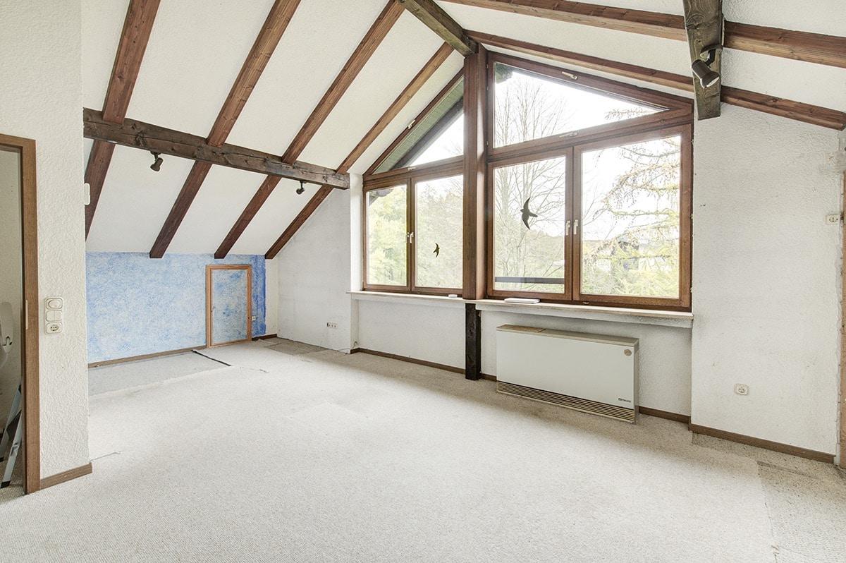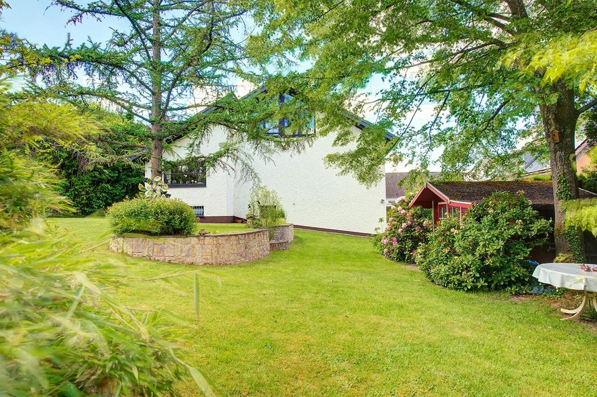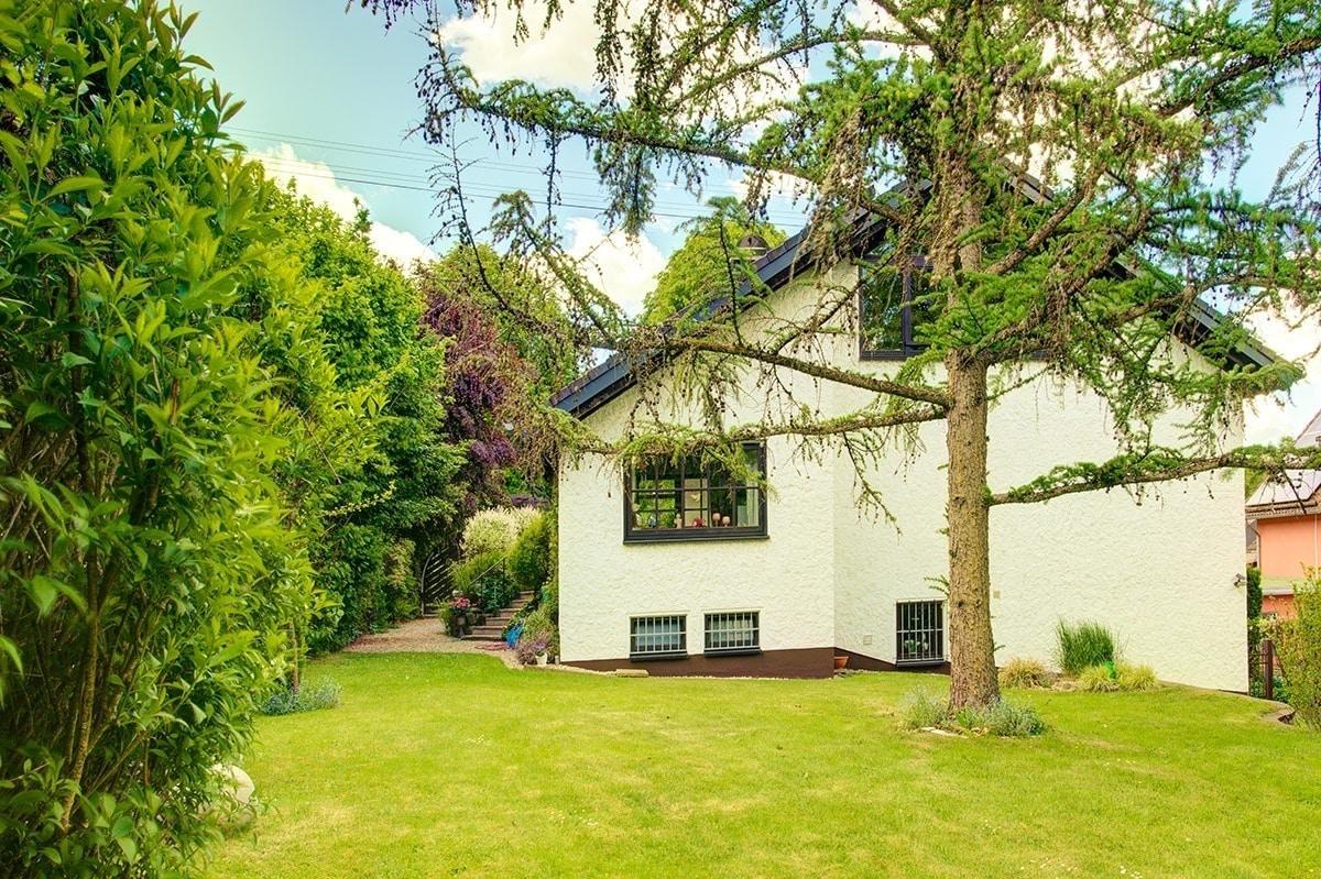 Der Haupteingangsbereich befindet sich im Untergeschoss des Wohnhauses. Auf dieser Ebene sind zudem Kaminzimmer, Gästezimmer oder Büro, Sauna, Dusche, WC und Kellerräume zu finden. Innerhalb des Erdgeschosses erstreckt sich der Hauptwohnbereich mit Küche, äußerst großzügigem Wohn- Esszimmer mit Ausgang zum Wohngarten, ein hübsches saniertes Duschbad sowie ein weiteres Zimmer. Im ausgebauten Dachgeschoss befinden sich zwei Studiozimmer und ein Speicherraum.