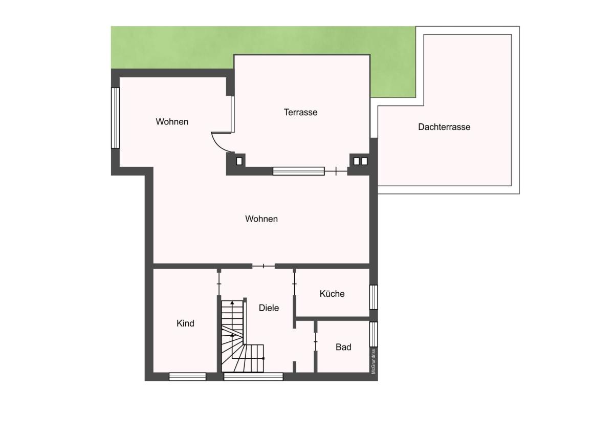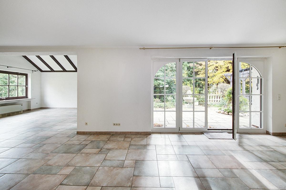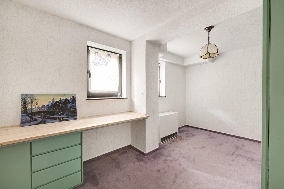 Der Haupteingangsbereich befindet sich im Untergeschoss des Wohnhauses. Auf dieser Ebene sind zudem Kaminzimmer, Gästezimmer oder Büro, Sauna, Dusche, WC und Kellerräume zu finden. Innerhalb des Erdgeschosses erstreckt sich der Hauptwohnbereich mit Küche, äußerst großzügigem Wohn- Esszimmer mit Ausgang zum Wohngarten, ein hübsches saniertes Duschbad sowie ein weiteres Zimmer. Im ausgebauten Dachgeschoss befinden sich zwei Studiozimmer und ein Speicherraum.