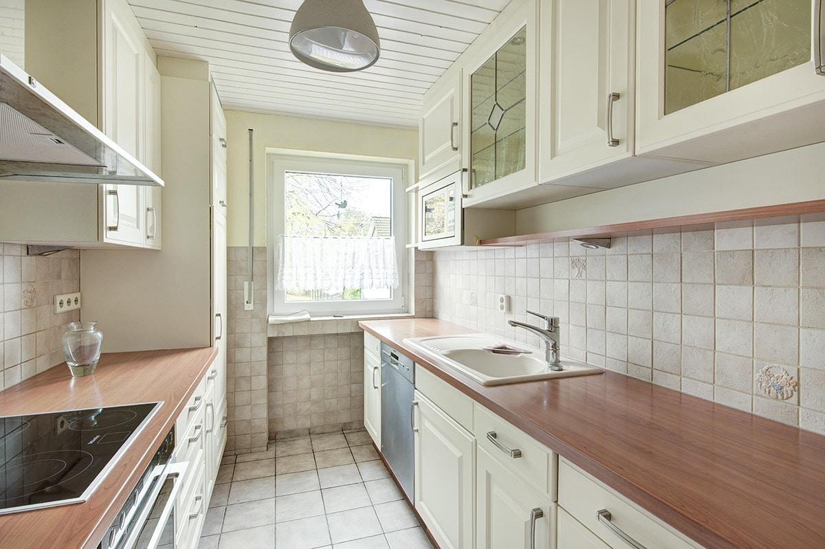 Zum Angebot gehört die vorhandene Einbauküche mit Elektrogeräten sowie die vorhandene Sauna im Untergeschoss.