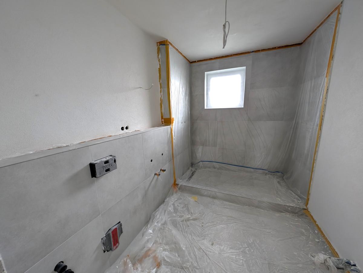 Das Badezimmer wird im zeitlos modernen Stil gestaltet. Eine begehbare Dusche mit Glasabtrennung, großformatige Fliesen sowie hochwertige Markensanitärobjekte sorgen für ein stilvolles und funktionales Raumkonzept.
