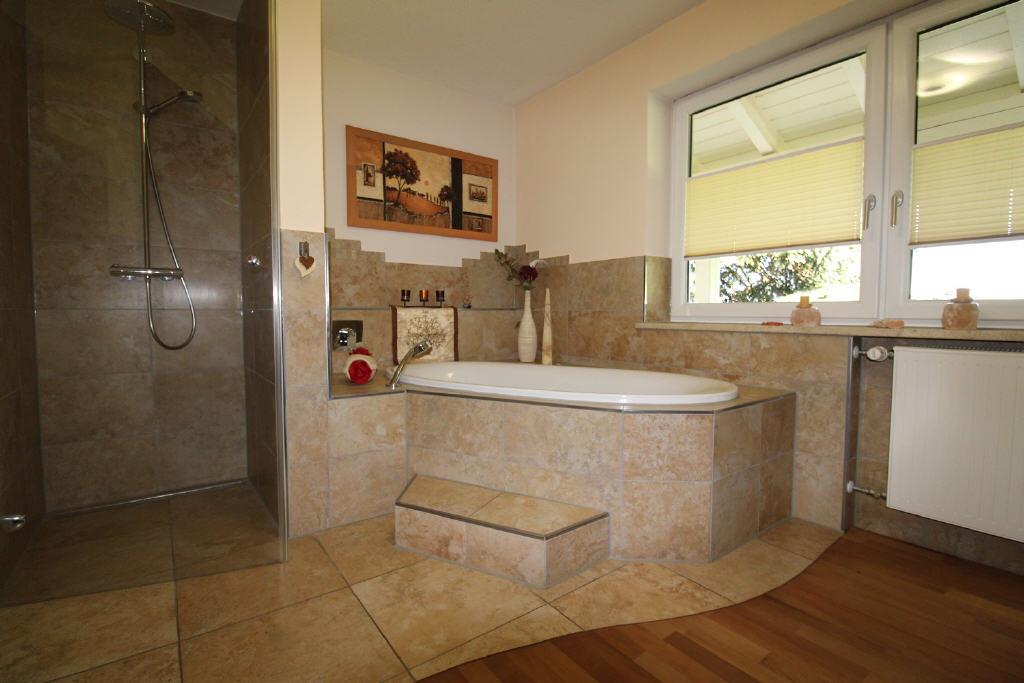 Das Bad, ebenfalls im mediterranen Stil mit hochwertigen Fliesen, Armaturen, Dusche und Badewanne wurde 2009 komplett erneuert.