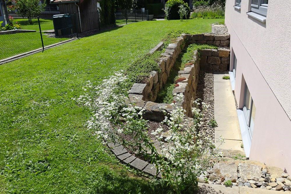 - im Souterrainbereich wurde die Abböschung durch terrassenähnlich angelegte Steinreihen verschönert
