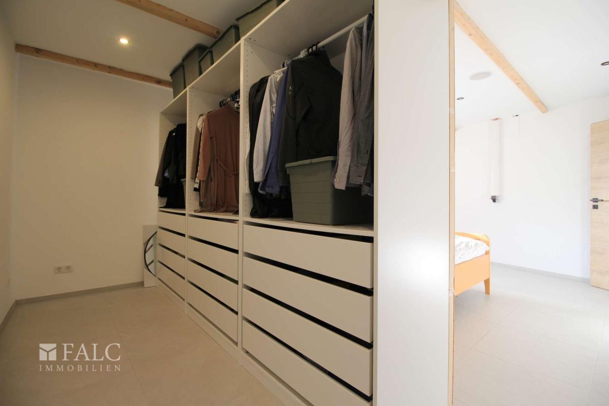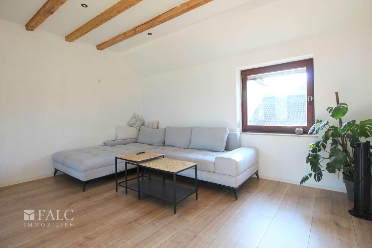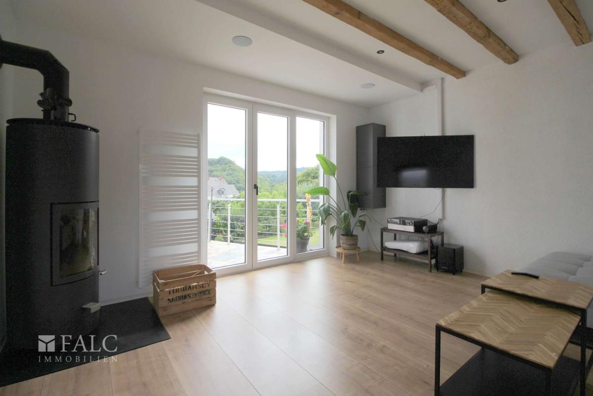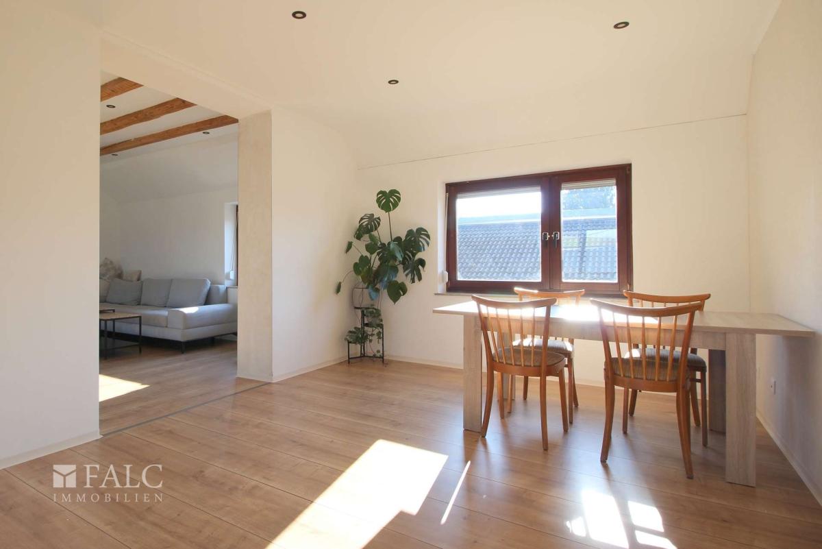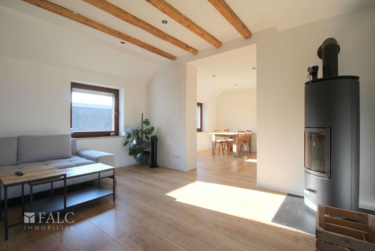 Besonders das Wohnzimmer im 1. Obergeschoss mit seinen sichtbaren Holzbalken und dem modernen Kamin lädt zum Entspannen ein. Die offene Küche auf dieser Etage ist ein Highlight für alle, die gerne kochen und Zeit mit der Familie verbringen. Sie bietet viel Platz und ist mit modernen Geräten ausgestattet. Direkt angrenzend befindet sich das Esszimmer sowie der Balkon mit Blick ins Grüne. Zwei Schlafzimmer ergänzen diese Wohneinheit mit ca. 125 m² Wohnfläche. Das Badezimmer ist modern gestaltet und ist mit einer Dusche ausgestattet.