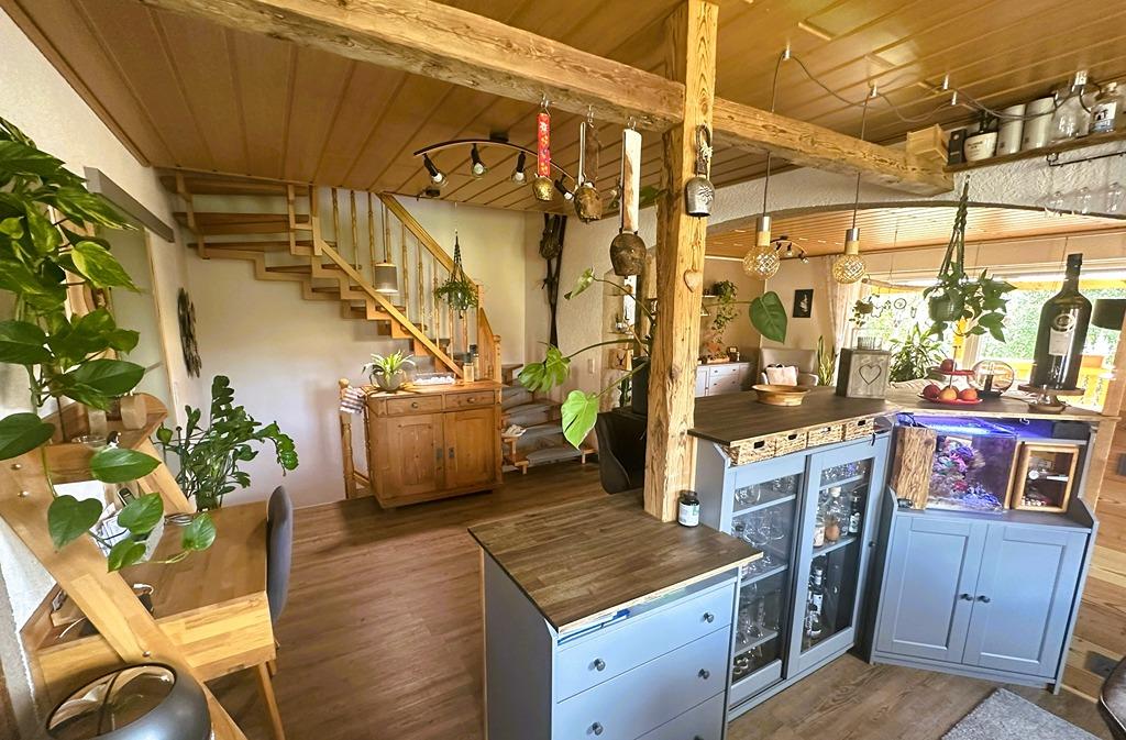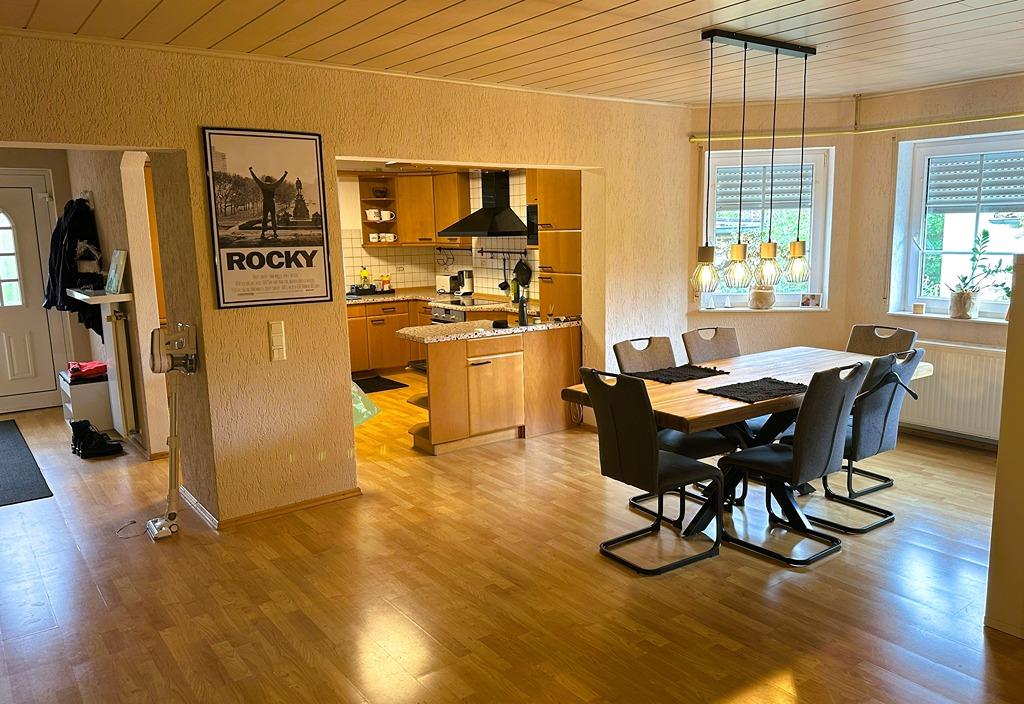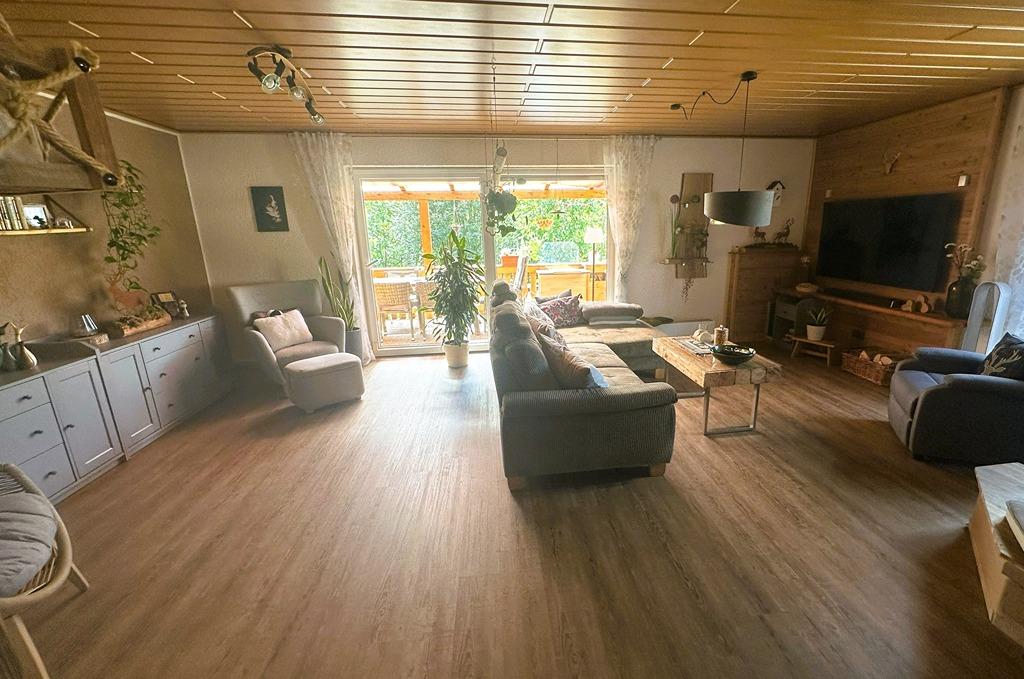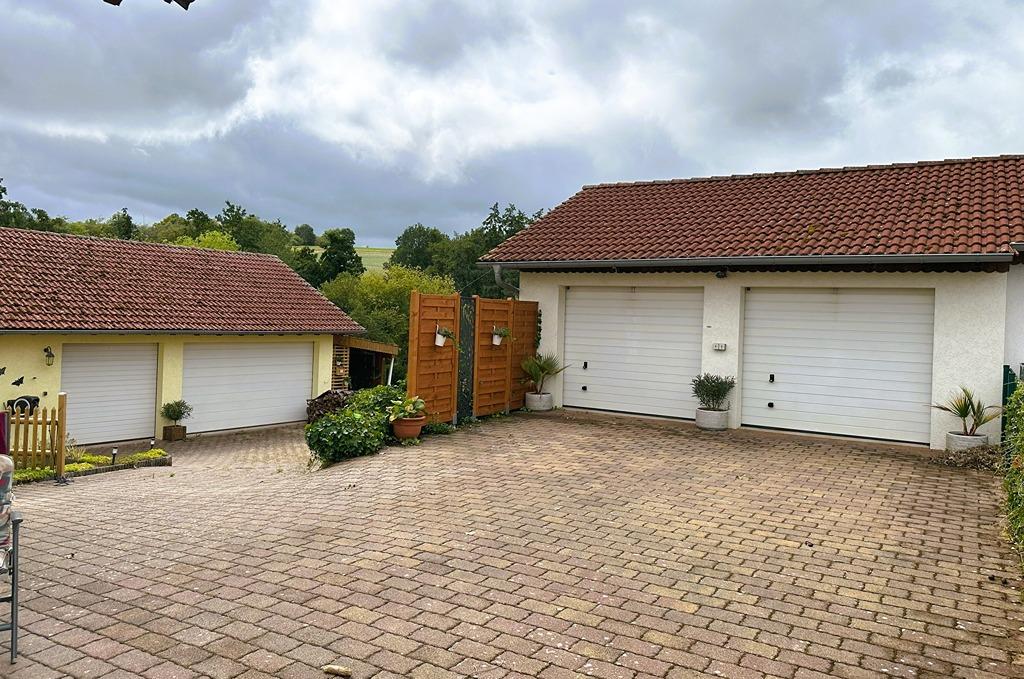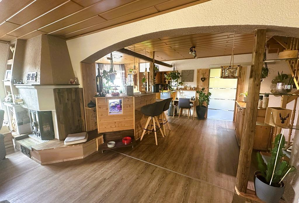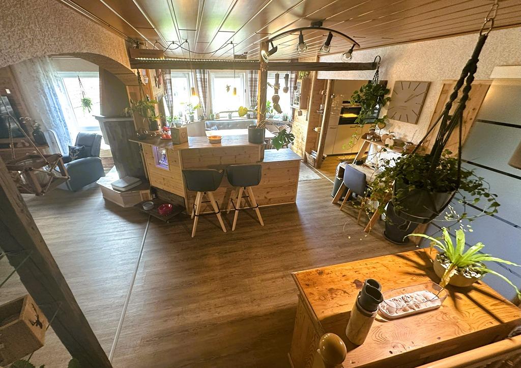 Grundstücksfläche von 800qm² mit zwei großzügigen Doppelgaragen, sowie einem gepflasterten Hof mit Vorgarten, offenem Schuppen und kleinem Teich. Ein traumhafter Blick in die Natur Richtung Westen macht die Lage perfekt. Die Räumlichkeiten wurden im Jahr 2023 umfangreich renoviert. Die Küche wurde neu gestaltet und modern ausgestattet, der Ess- und Wohnbereich wurde mit Holzdielen an Wand und Balken im Raum qualitätsvoll im Landhausstil gestaltet und ein neuer Bodenbelag wurde verlegt. Das Gäste-WC wurde modernisiert und das Hauptbad in gehobener Ausstattung renoviert. Es wurden eine große Dusche mit Fußbodenheizung und hochwertige Sanitärelemente neu installiert, Holzelemente sowie eine Sauna integriert und der Bodenbelag erneuert.