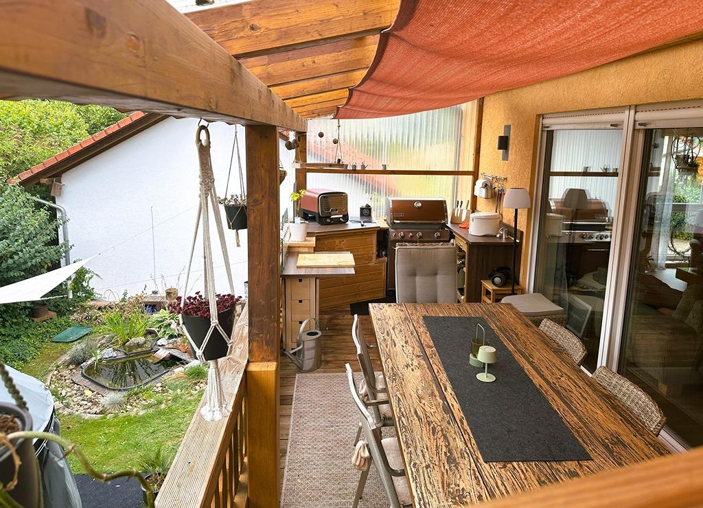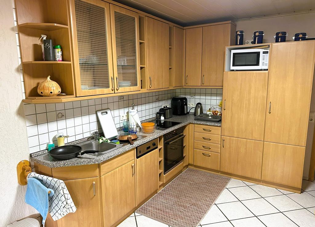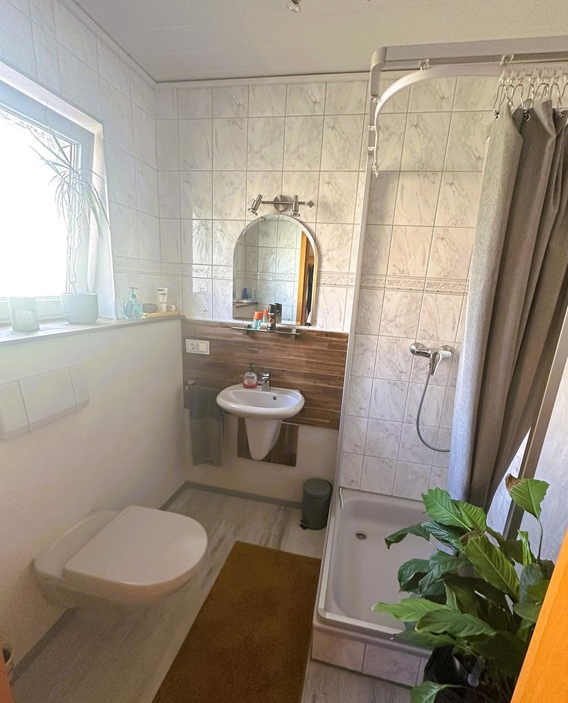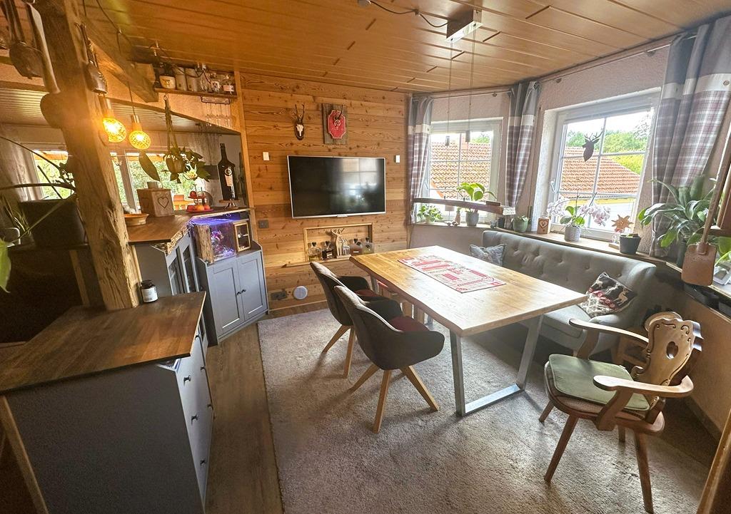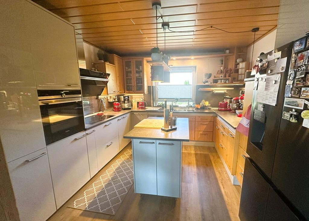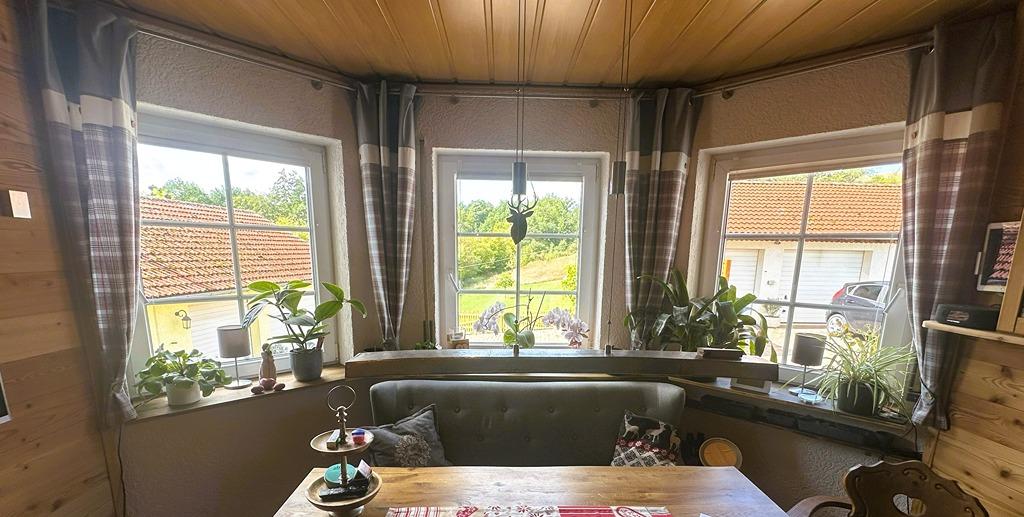 Grundstücksfläche von 800qm² mit zwei großzügigen Doppelgaragen, sowie einem gepflasterten Hof mit Vorgarten, offenem Schuppen und kleinem Teich. Ein traumhafter Blick in die Natur Richtung Westen macht die Lage perfekt. Die Räumlichkeiten wurden im Jahr 2023 umfangreich renoviert. Die Küche wurde neu gestaltet und modern ausgestattet, der Ess- und Wohnbereich wurde mit Holzdielen an Wand und Balken im Raum qualitätsvoll im Landhausstil gestaltet und ein neuer Bodenbelag wurde verlegt. Das Gäste-WC wurde modernisiert und das Hauptbad in gehobener Ausstattung renoviert. Es wurden eine große Dusche mit Fußbodenheizung und hochwertige Sanitärelemente neu installiert, Holzelemente sowie eine Sauna integriert und der Bodenbelag erneuert.