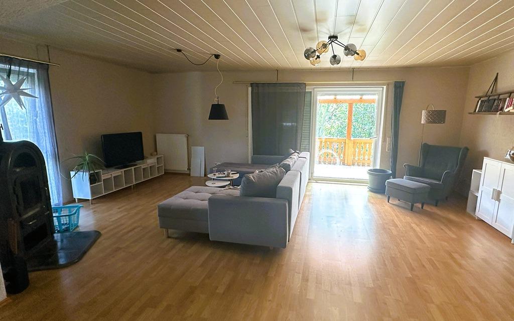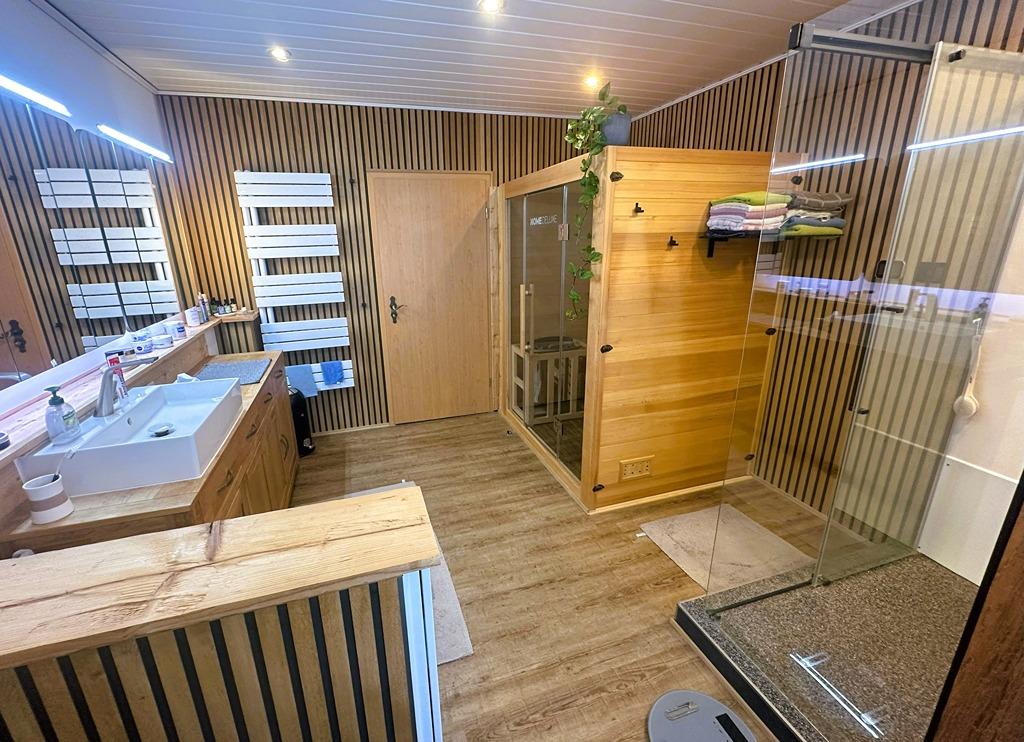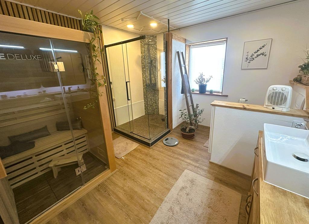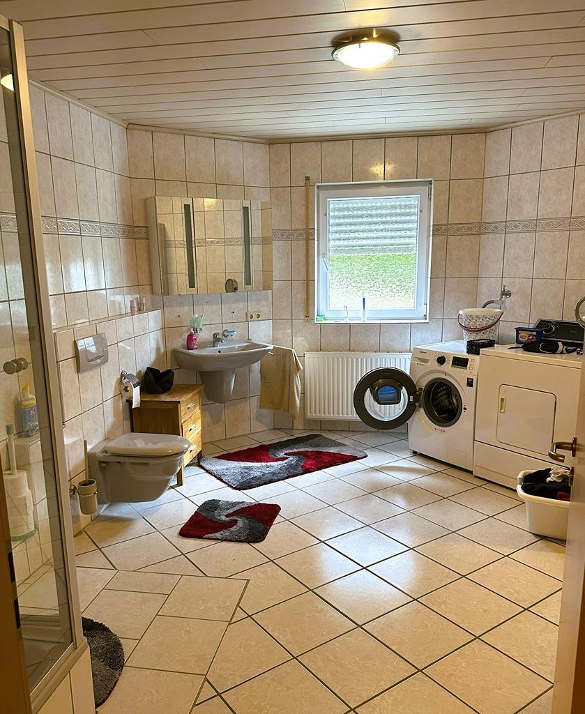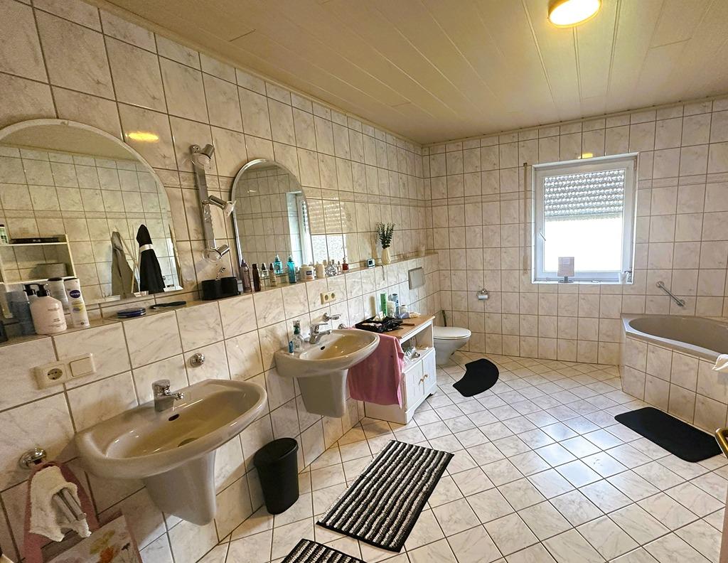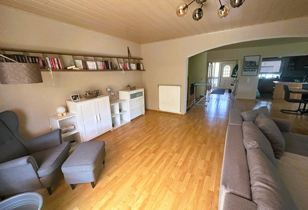 Grundstücksfläche von 800qm² mit zwei großzügigen Doppelgaragen, sowie einem gepflasterten Hof mit Vorgarten, offenem Schuppen und kleinem Teich. Ein traumhafter Blick in die Natur Richtung Westen macht die Lage perfekt. Die Räumlichkeiten wurden im Jahr 2023 umfangreich renoviert. Die Küche wurde neu gestaltet und modern ausgestattet, der Ess- und Wohnbereich wurde mit Holzdielen an Wand und Balken im Raum qualitätsvoll im Landhausstil gestaltet und ein neuer Bodenbelag wurde verlegt. Das Gäste-WC wurde modernisiert und das Hauptbad in gehobener Ausstattung renoviert. Es wurden eine große Dusche mit Fußbodenheizung und hochwertige Sanitärelemente neu installiert, Holzelemente sowie eine Sauna integriert und der Bodenbelag erneuert.