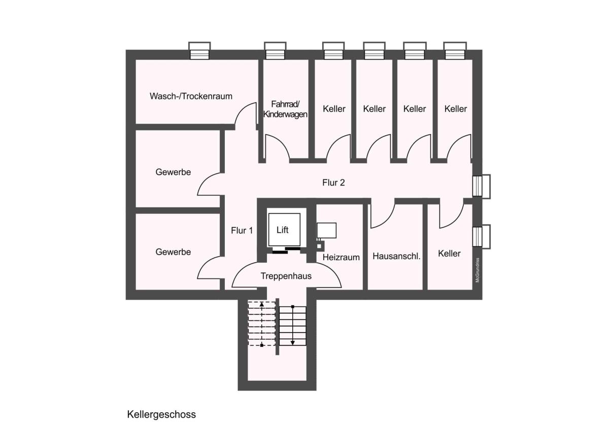 Waschmaschine und Trockner können im Kellergeschoss des Gebäudes untergebracht werden. Hier befindet sich zudem ein Abstellbereich für Fahrräder und Kinderwagen.
