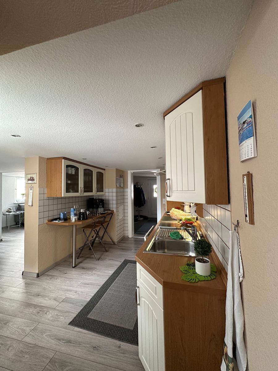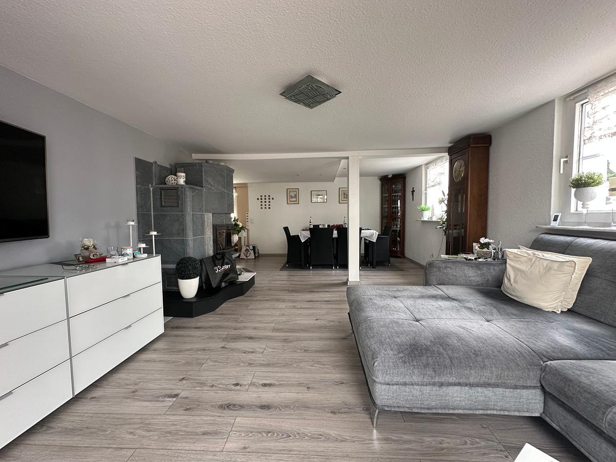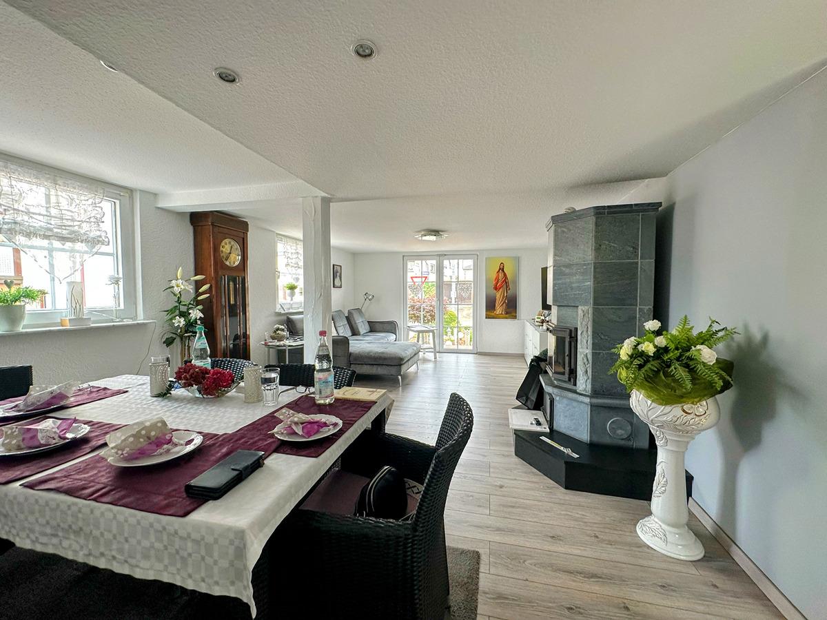 1 Wohn-Esszimmer mit gemauertem Kamin (Speckstein), Hauswirtschaftsraum,
