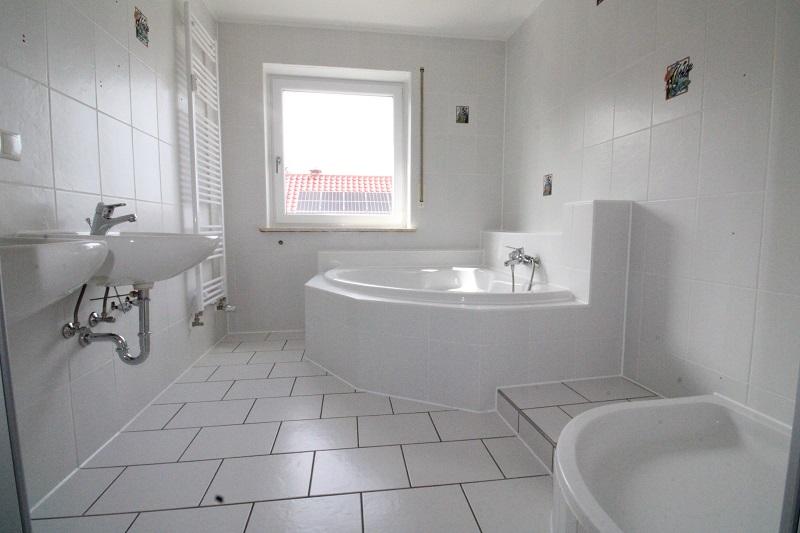 Das große Tageslichtbad wurde 2000 neu gestaltet und überzeugt durch schöne moderne helle Fliesen, zwei Waschbecken, einer Dusche und großer Badewanne.