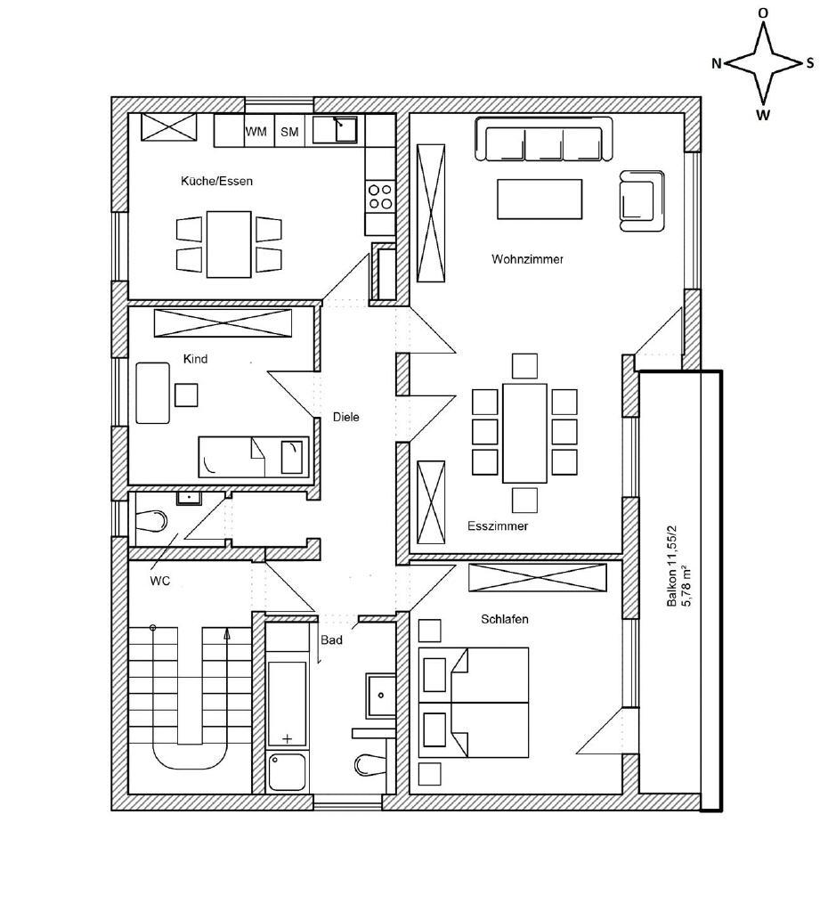 Den nach Süden ausgerichtete Balkon erreichen Sie durch das Wohn-Esszimmer sowie über das Elternschlafzimmer.
