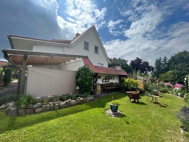 In diesem Gartenparadies befindet sich eine große sonnengeschützte Terrasse, ein Insektenhotel und mehrere einladende Sitzgelegenheiten. Das stimmige Gesamtbild überzeugt mit jedem Detail und wurde mit viel Sorgfalt kreiert. Fühlen sie sich willkommen.