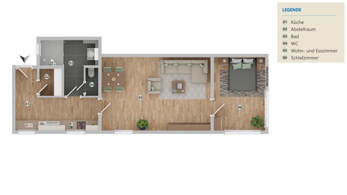 Zum Verkauf steht nun die letzte verfügbare Wohnung des Umbaus – eine großzügige 2-Zimmer-Souterrainwohnung mit ca. 66 m² Wohnfläche. Die Wohnung überzeugt durch eine durchdachte Raumaufteilung mit einem offen gestalteten Wohn- und Essbereich, einer separaten Küche mit moderner Einbauküche, Schlafzimmer, einem innenliegenden Bad sowie einer praktischen Abstellkammer innerhalb der Wohnung.