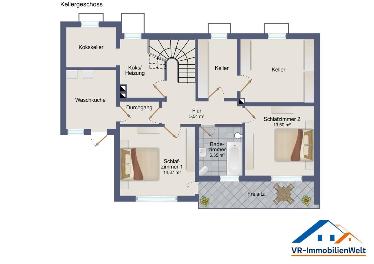 • Kellergeschoss: 2 Schlafzimmer und ein Badezimmer, Terrassenzugang bzw. Gartenzugang, Heizungsraum, Waschküche und Abstellräume