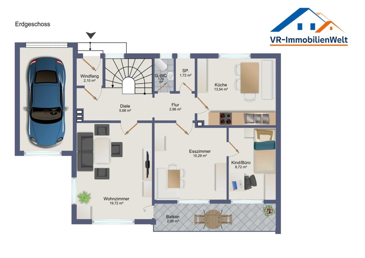 • Erdgeschoss: Heller Wohn- und Essbereich mit Zugang zu Balkon, Büro, welches an das Wohn- und Esszimmer angrenzt, Küche sowie Speisekammer und