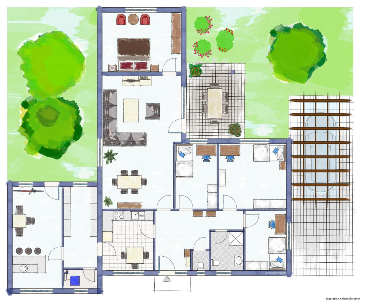 Die heute etwa 128,59 qm große Wohnfläche ist vollständig ebenerdig und barrierefrei ausgestattet. Sie unterteilt sich wie folgt: