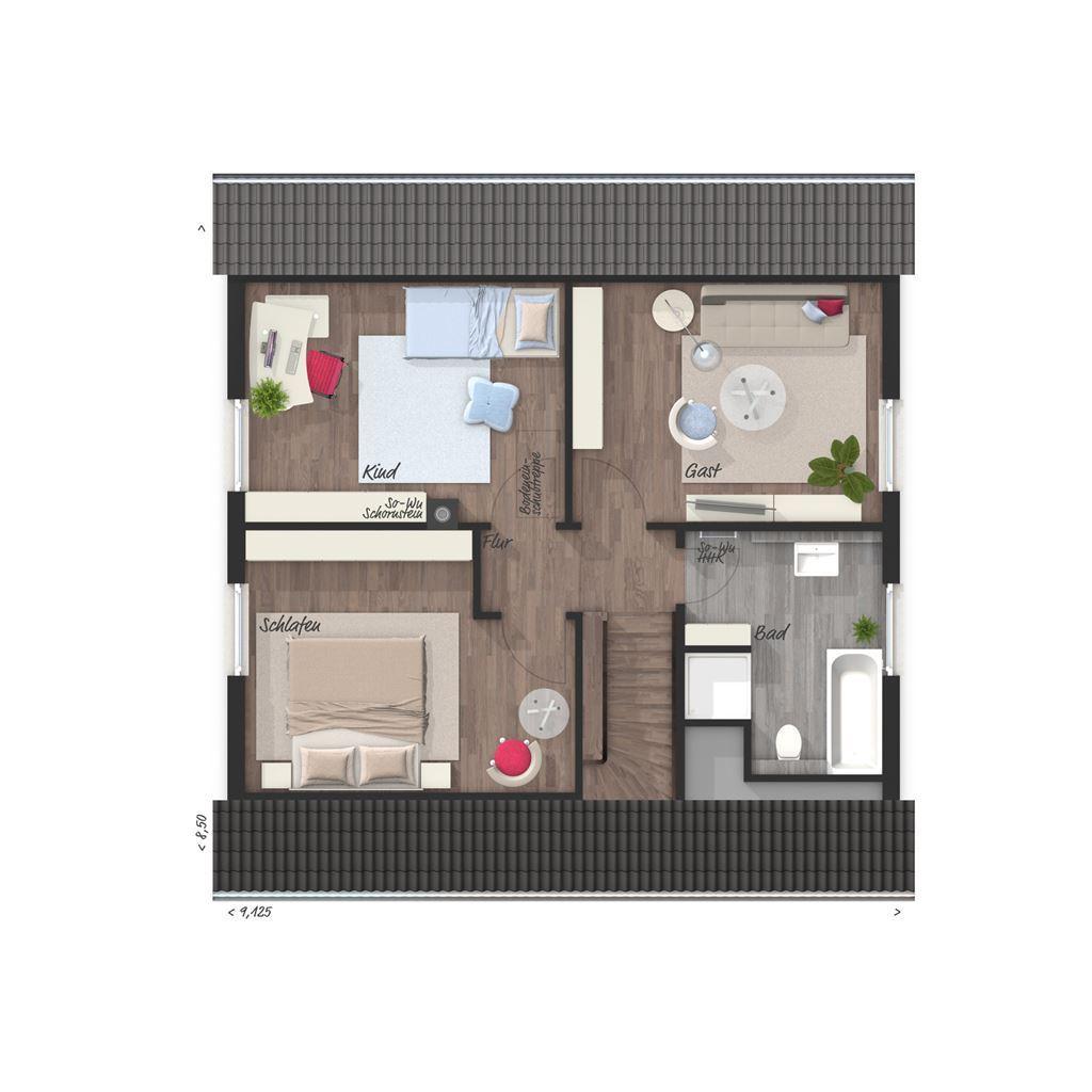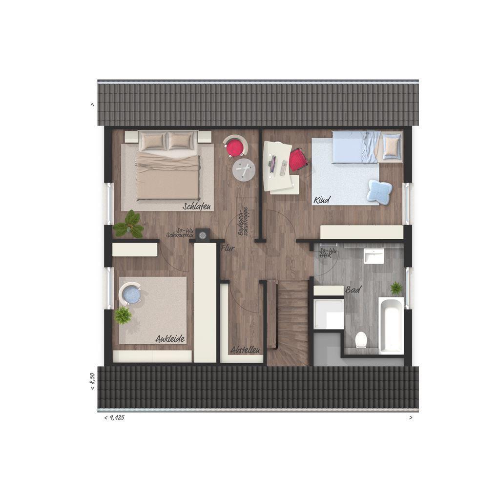 Wohnzimmer und Essbereich sind miteinander verbunden und die geräumige Küche wird schnell zum beliebten Familientreffpunkt. Bei Bedarf, zum Beispiel für das Büro zu Hause, kann im Erdgeschoss noch ein weiteres Zimmer eingeplant werden. Das "Flair 110" ist großzügig gestaltet, sowohl im Schlaf-, Kinder- und Gästezimmer, als auch im Bad. Dieses Familienhaus überzeugt mit seinem Charme.