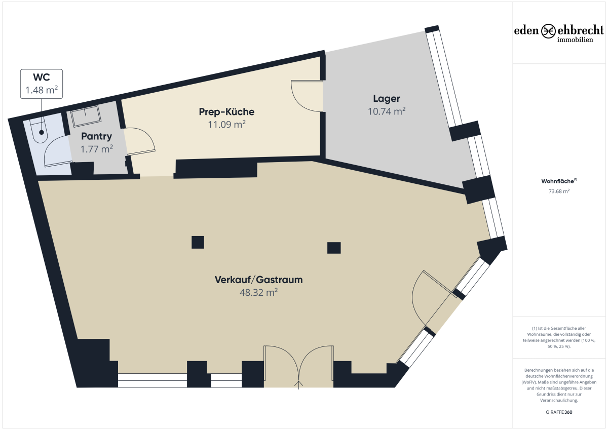 Die insgesamt 78 m² große Fläche wird derzeit als Teil-Gastronomie genutzt. Der Eigentümer ist aber prinzipiell offen für verschiedenste Konzepte.