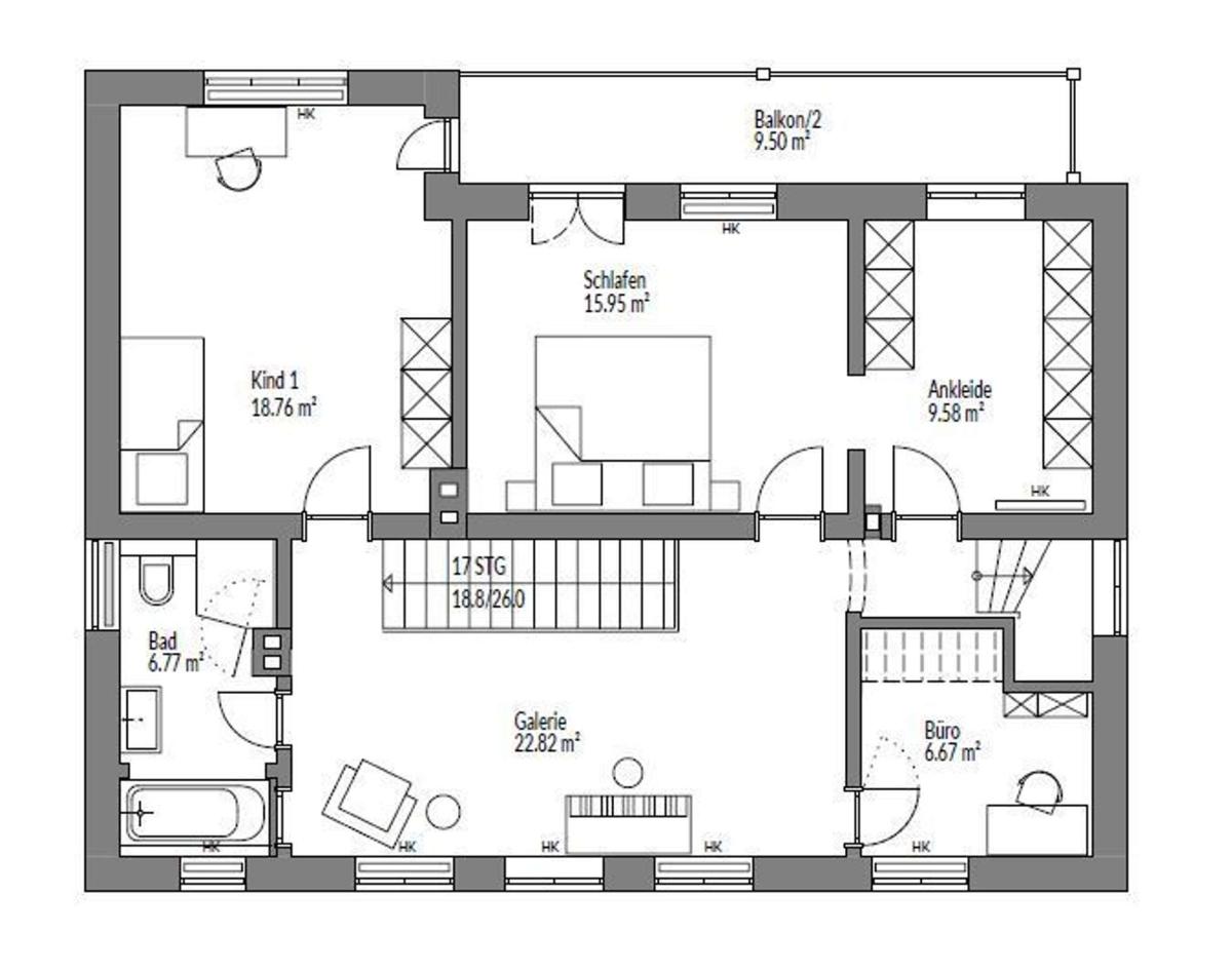 Über die original erhaltene Massivholztreppe gelangen Sie in das Obergeschoss. Dort empfängt Sie ein großzügiger Galeriebereich. Das Hauptschlafzimmer mit angeschlossener Ankleide, ein helles Tageslichtbad mit Dusche und Badewanne sowie ein Kinderzimmer und ein separates Homeoffice bieten Rückzugsorte mit Atmosphäre und Stil. Im Dachgeschoss erwarten Sie zwei weitere geräumige Zimmer sowie ein eigenes Duschbad – ideal als Gäste- oder Jugendbereich.