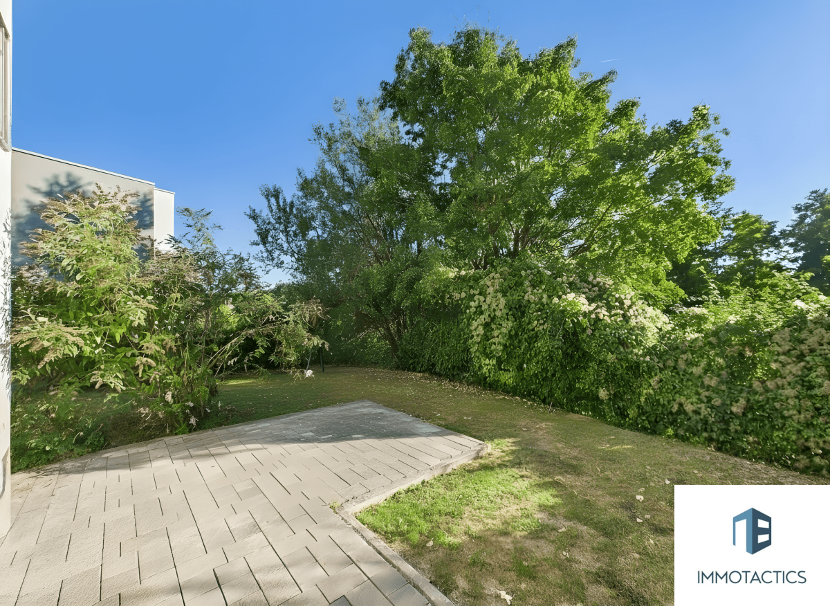 Die Terrasse ist über das Wohnzimmer zugänglich und bietet ausreichend Platz für einen großen Esstisch. Der Garten ist pflegeleicht angelegt und bietet eine gute Mischung aus Rasenfläche und Terrassenanteil – ideal für Kinder, Grillabende oder einfach zum Durchatmen.