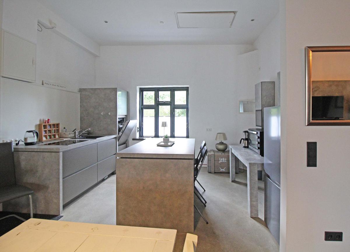 - Moderne Einbauküche, individuell gestaltetes Bad