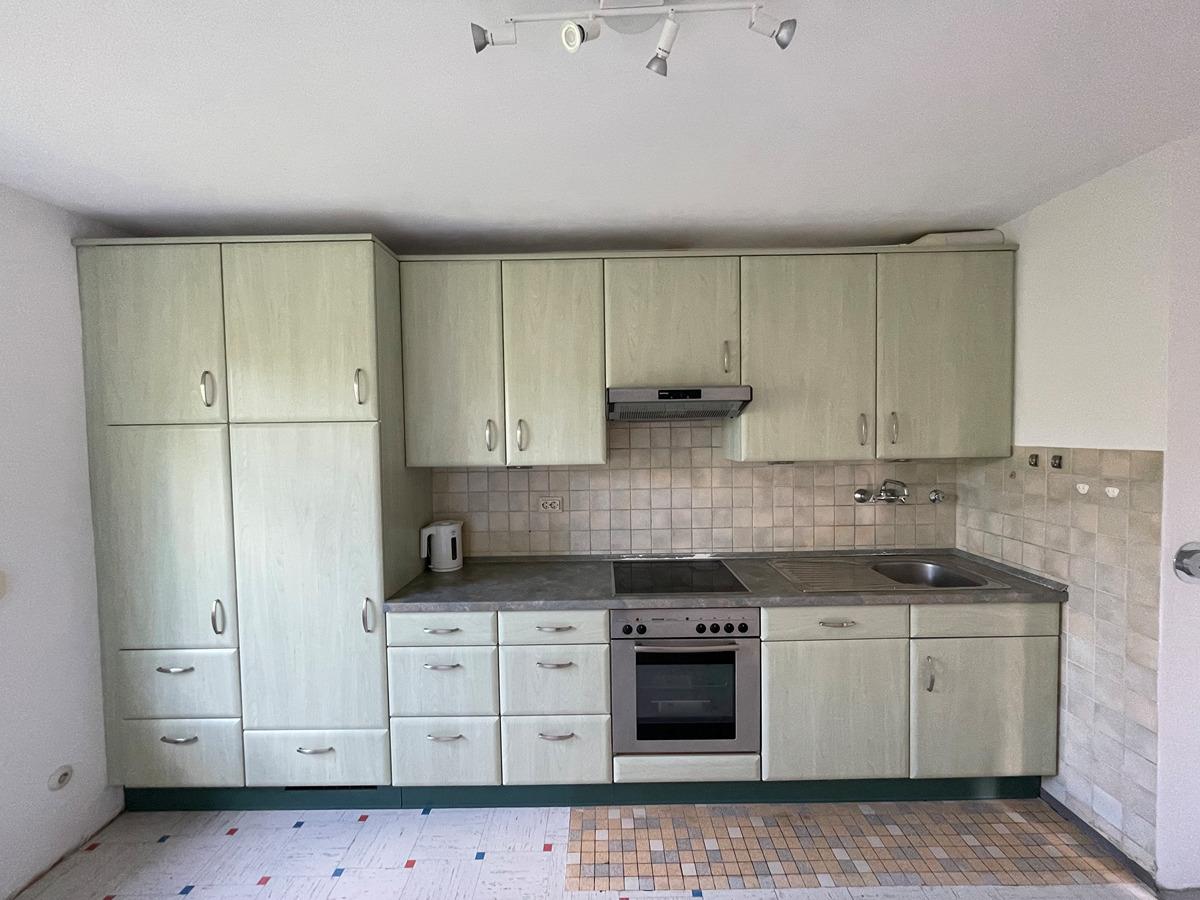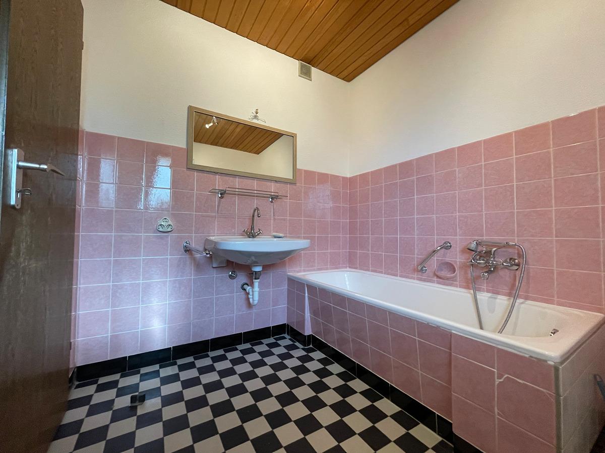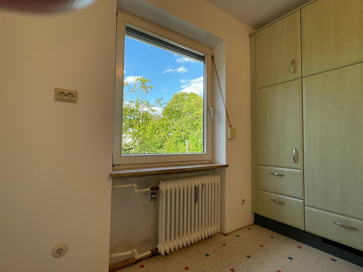 Das Wohnzimmer besitzt eine ungewöhnliche große Glasfront, die sehr viel Licht in den Raum läßt. Das Bad ist original aus den 60er Jahren. Die Einbauküche stammt aus dem Jahr 2003 (im Preis enthalten).