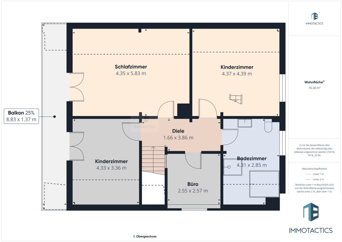 Im Obergeschoss erwartet Sie ein helles Schlafzimmer, weitere Zimmer für Kinder sowie ein Tageslichtbad, das mit einer komfortablen Fußbodenheizung ausgestattet ist. Diese sorgt nicht nur für angenehm warme Füße, sondern verteilt die Wärme gleichmäßig im gesamten Bad und schafft dadurch ein behagliches Wohlfühlklima. Ein Zimmer verfügt über eine Empore, die sich als gemütlicher Schlafplatz oder als erhöhte Spielecke nutzen lässt – ein Detail, das Kindern gefällt und den Raum flexibel macht. Alternativ kann die Empore auch als zusätzlicher Stauraum genutzt werden. Der langgezogene Balkon unter dem Dach schützt vor Wetter und erweitert in den warmen Monaten den Wohnbereich nach draußen.