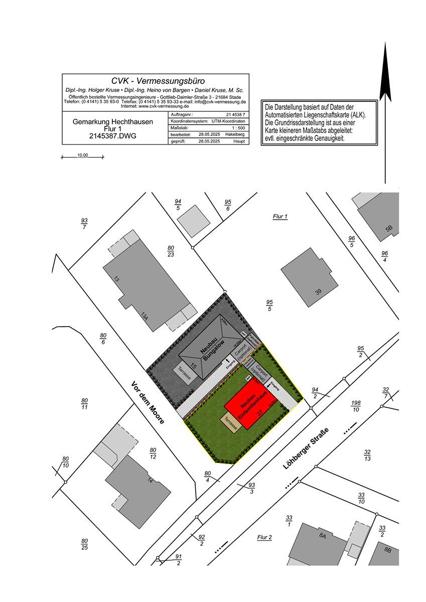 Der Neubau entsteht in Hechthausen, Löhberger Straße 37. Die Grundstücksfläche beträgt ca. 442 m² und bietet Platz für individuelle Gestaltungsideen. Die Terrasse mit ca. 15 m² ist zum Süd-Westen ausgerichtet.