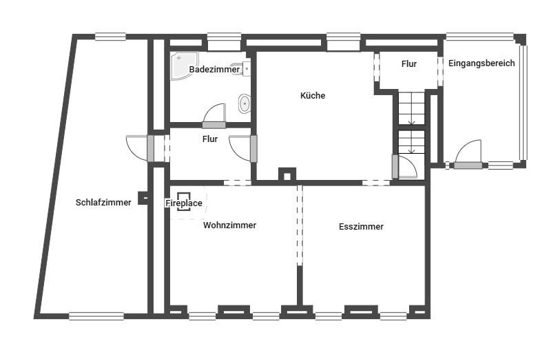 - Erdgeschoss mit eigenem Bad (2013), Küche, Wohn- und Schlafzimmern – mit Sanierungsbedarf
