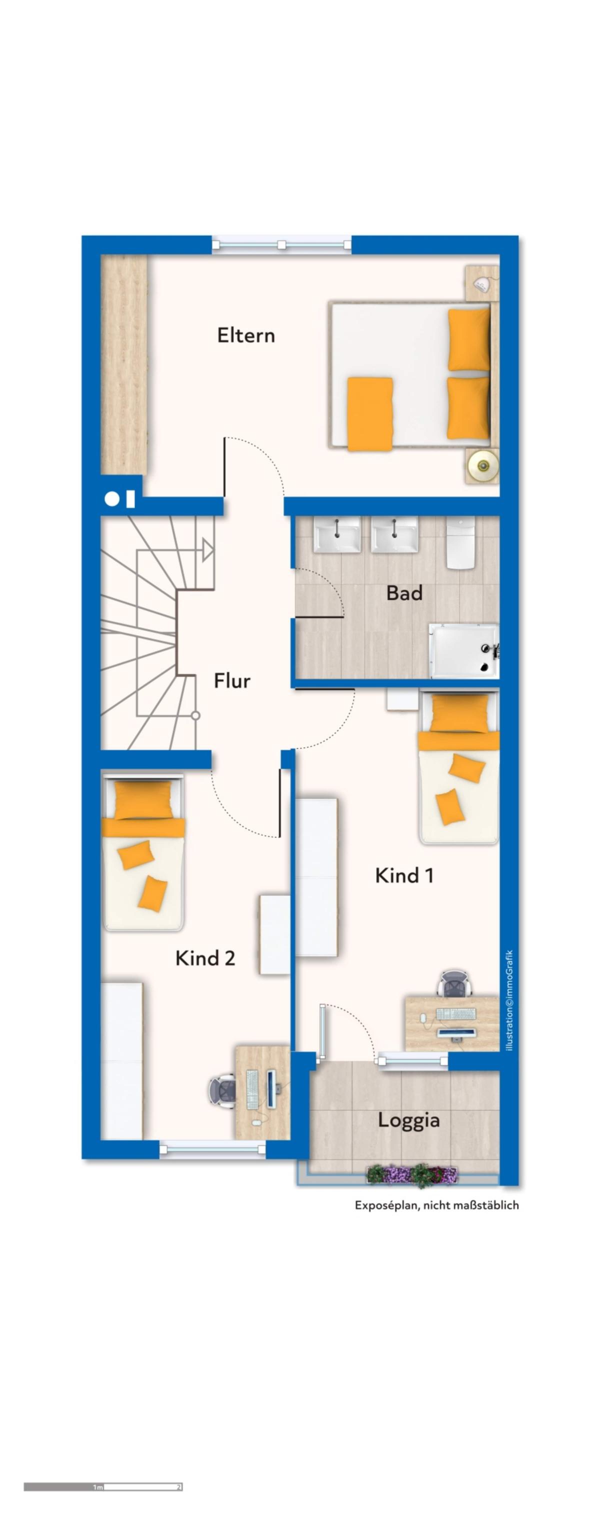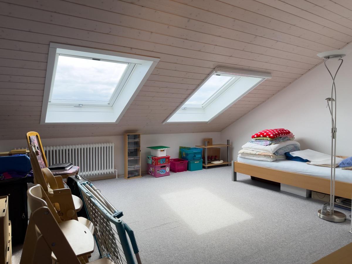 Im Obergeschoss ist das Elternschlafzimmer sowie zwei kleinere, mögliche Kinderzimmer oder Büro, das Hauptbad und ein Balkon. Das ausgebaute Dachgeschoss enthält ein großzügiges Schlaf- und Wohnzimmer mit separatem, kleinen Tageslichtbad mit Wanne.
