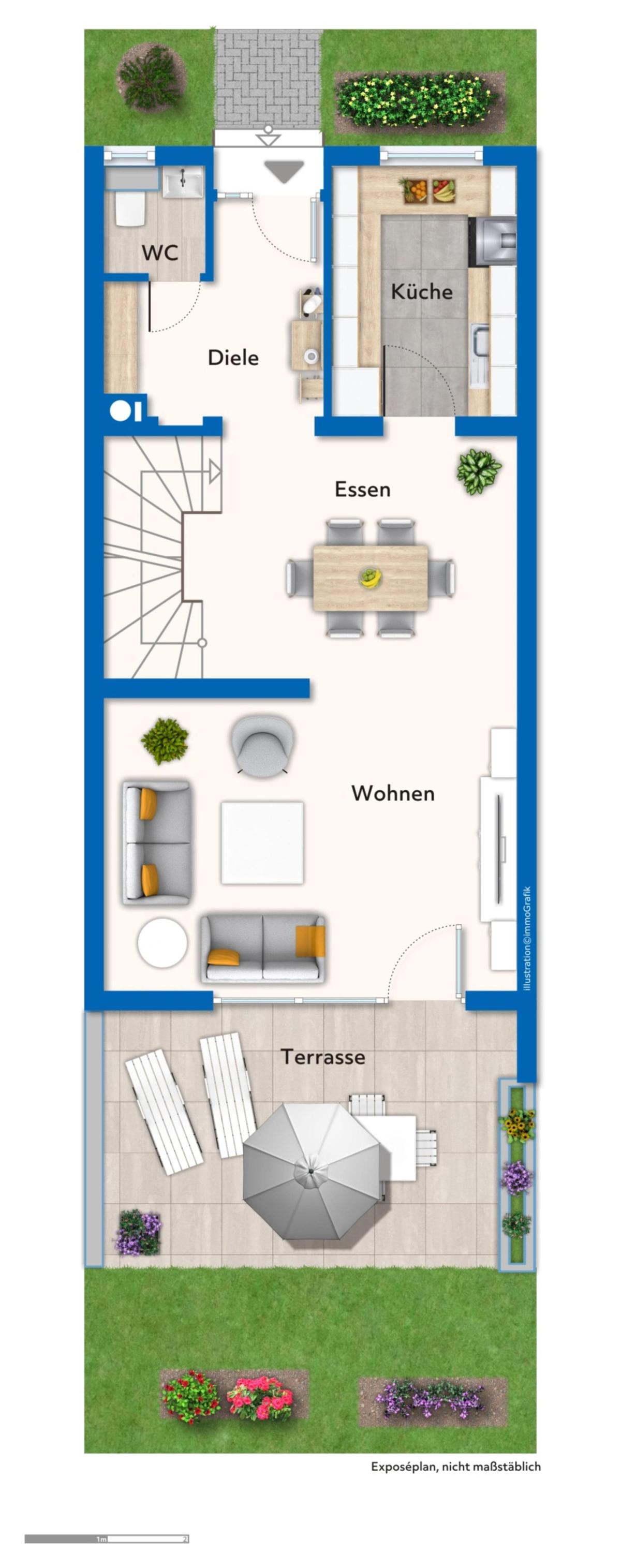 Der Hauptwohnbereich im Erdgeschoss ist vom Eingangsbereich mit Gäste-WC durch eine Türe abgetrennt und beinhaltet den Essbereich mit angrenzendem Wohnbereich und Zugang auf die Terrasse, sowie den kleinen aber schön angelegten Garten. Die enthaltene, voll ausgestattete und sehr gepflegte Einbauküche ist im Preis inbegriffen.