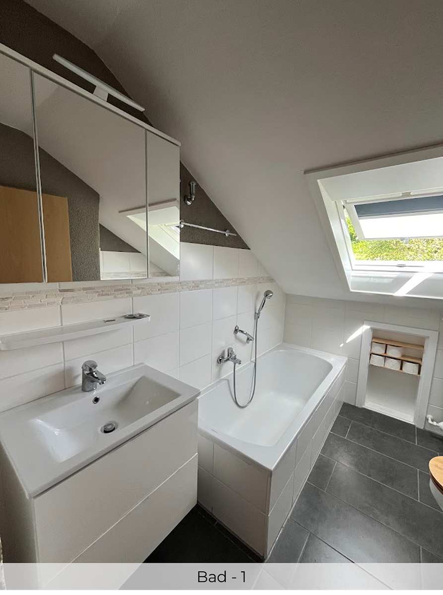 Renoviertes Badezimmer mit Fenster, Badewanne, Waschtisch und WC (Renovierung 2019)