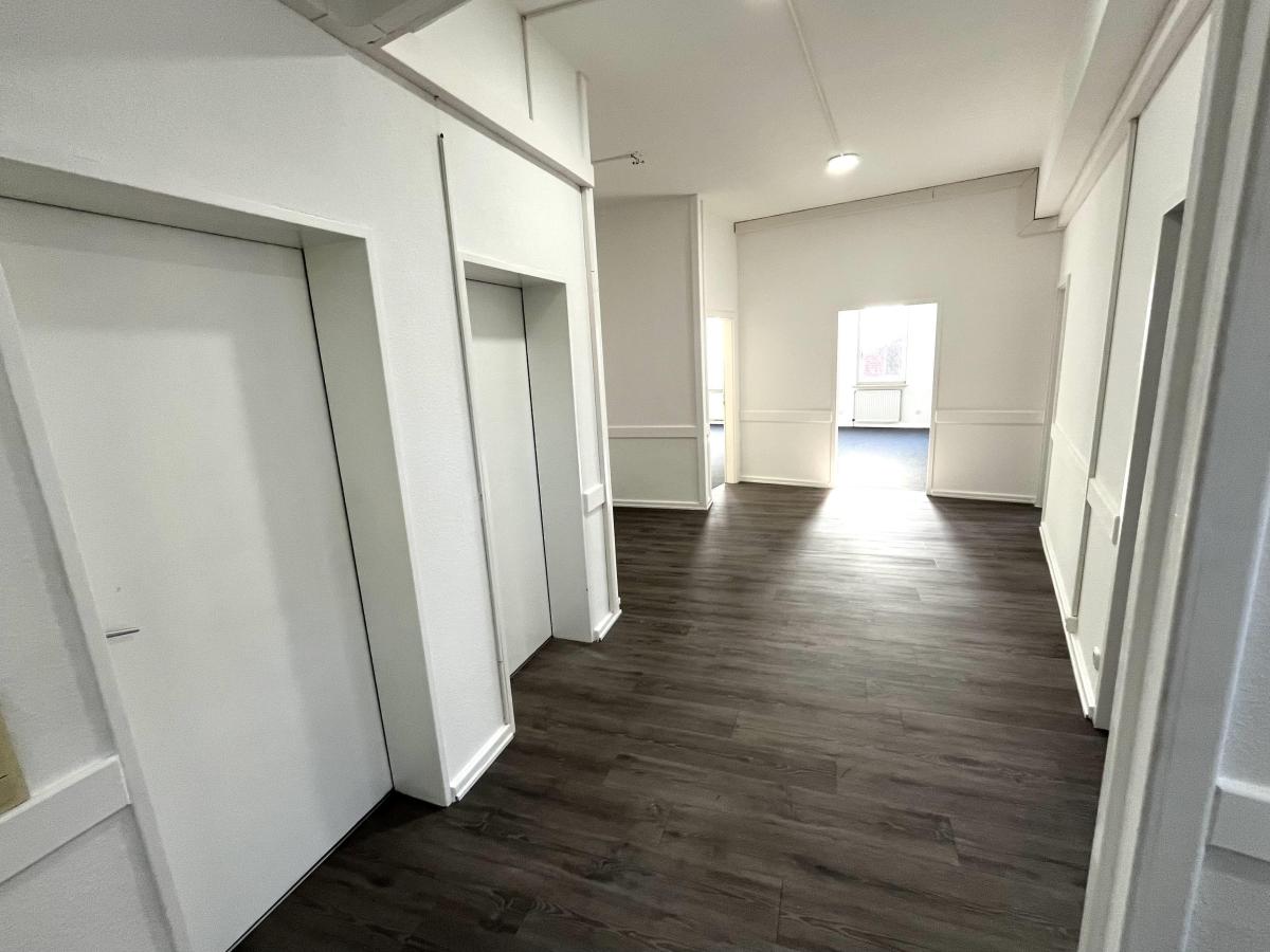Der große Flur verbindet alle Räume und sorgt für eine optimale Erreichbarkeit. Dies ermöglicht eine flexible Nutzung der einzelnen Büros, sei es für Teamarbeit, Besprechungen oder individuelle Arbeitsplätze. Eines der Zimmer verfügt sogar über einen eigenen Balkon, der Ihnen und Ihren Mitarbeitern die Möglichkeit bietet, frische Luft zu schnappen und eine kurze Auszeit im Freien zu genießen.
