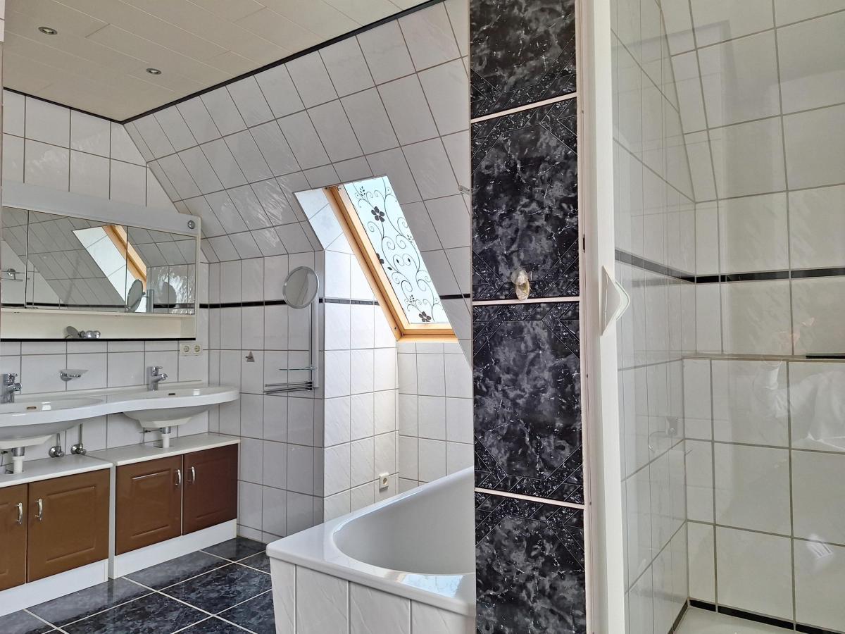 Im Obergeschoss befindet sich ein großes Schlafzimmer und das modernisierte Tageslichtbad mit Badewanne und Dusche. Auf dem Flur steht zusätzlicher Stauraum in der Abseite zur Verfügung.