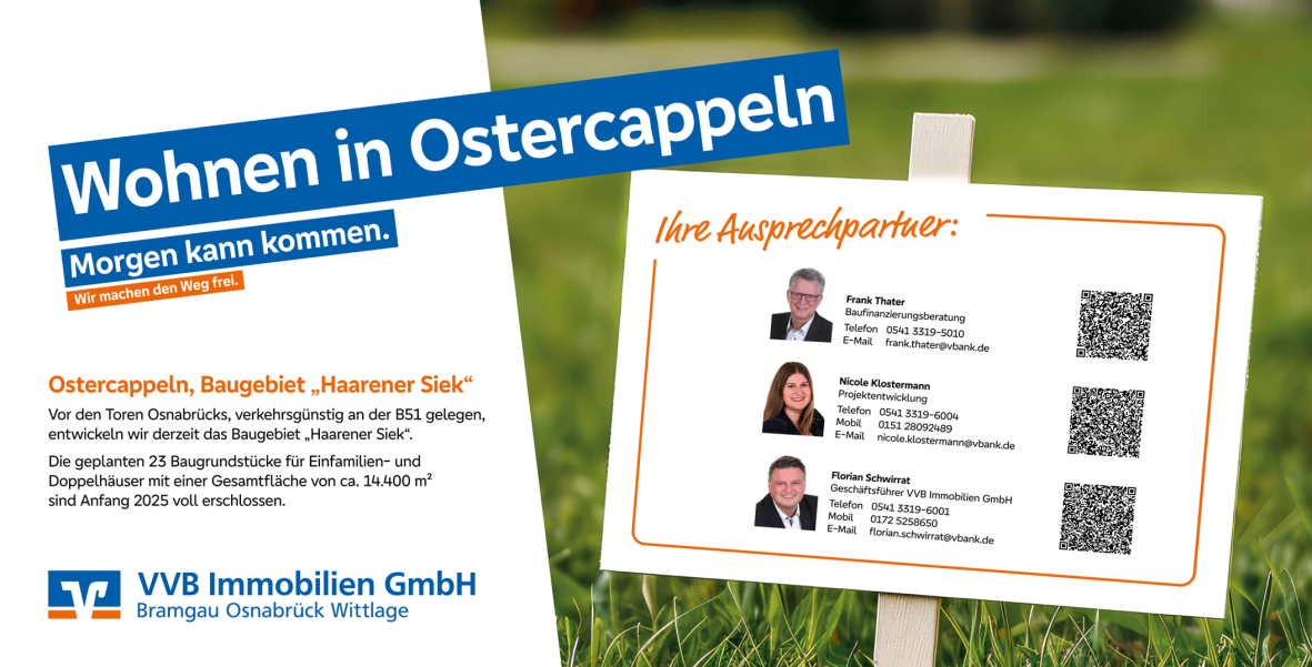 Mit dem Neubaugebiet "Haarener Siek" schließen wir unmittelbar an die Bebauung der beiden Baugebiete 'Bergfrieden' und 'Zur Bergwiese' in Ostercappeln an.