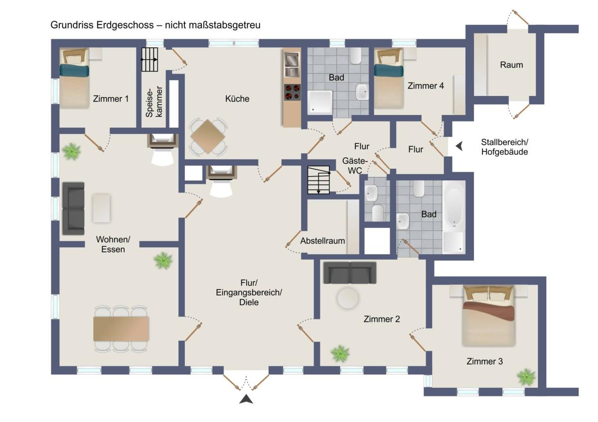 Wenn Sie den Wohnbereich betreten, gelangen Sie zunächst in eine Diele, die als großzügiger Eingangsbereich dient. Hier werden Sie direkt von dem urigen Charme des Gebäudes empfangen. Für besondere Gemütlichkeit sorgen die beiden Kaminöfen, die sich auf der Diele und dem großen Wohn- und Esszimmer nebenan befinden. Das einzigartige Flair der Immobilie ist auch in diesem Raum zu spüren und spiegelt sich vereinzelt im Rest des Wohnbereiches wieder. Es erwarten Sie eine geräumige helle Küche, vier weitere Zimmer, zwei Bäder und ein Gäste-WC. Es stehen Ihnen zudem ein Abstellraum, eine Speisekammer und ein Vorratsraum im Keller zur Verfügung. Der Dachboden kann als Ausbaureserve oder weitere Lagerfläche genutzt werden. Von den Wohnräumen aus erreichen Sie direkt den Teil des Gebäudes, der dem Hof dient. Der Stallbereich ist vom Wohnbereich als auch von außen über ein großes Scheunentor zugänglich. In diesem Gebäudeteil finden Sie mehrere Pferdeboxen, viel Stellfläche und einen weiteren Lagerraum.